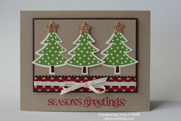 These little trees just make me smile! I think they are so cute and I love polka dots. I stamped and die cut three of them out and added three little stars made of the champagne glimmer paper (love that stuff!). I embossed the greeting with Cherry Cobbler embossing powder. This was an easy card to make.