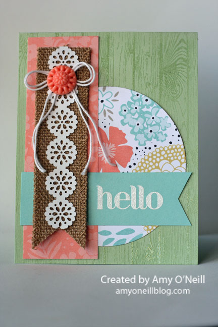 Embellishments: In Color Boutique Details, Delicate Details Lace Tape, White Baker’s Twine, Clear and White Stampin’ Emboss Powder, Circle Framelits, 1-1/4″ Burlap Ribbon
