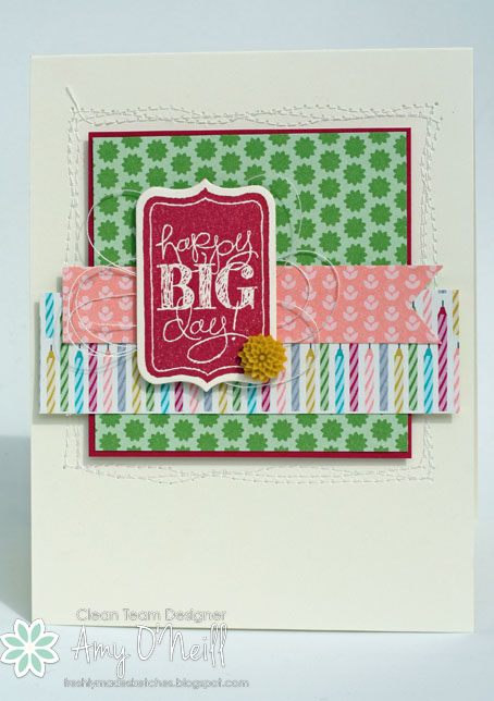 I love this sketch, Amy – it’s one of my favorites and I’m going to keep it to use again! Your card is fabulous – I’m so impressed with your stitching and the thread behind the central image is a great embellishment.