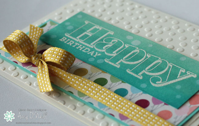 Happy Watercolored BirthdayI started by embossing the sentiment from Countless Sayings 2 (one of the photopolymer sets) with clear embossing powder on Very Vanilla card stock.  I used a sponge dauber and dragged some Bermuda Bay ink across the bottom, some Coastal Cabana ink on the middle, and some Pool Party ink on the top, blending a little each time.  With a small wet paintbrush, I lightly touched the card stock, depositing little drops of water on it.  Easy peasy!