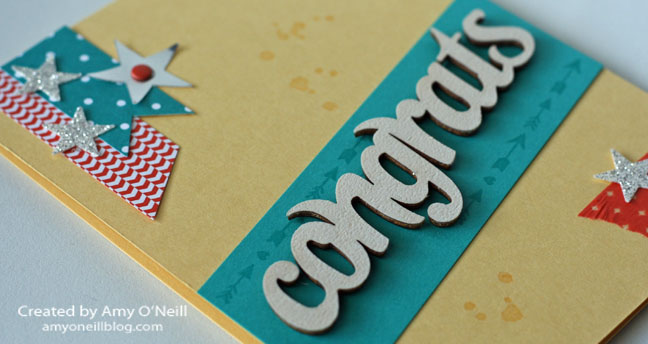 Pumpkin Congrats Close UpI used some more My Paper Pumpkin goodies on this card.  The “congrats” comes from a recent kit and is made of wood.  I stamped my Versamark pad on it and covered it with white embossing powder.  The little arrow stamps also came from another My Paper Pumpkin kit.  The colors used are Bermuda Bay, Tangerine Tango, and So Saffron (some of her favorites).