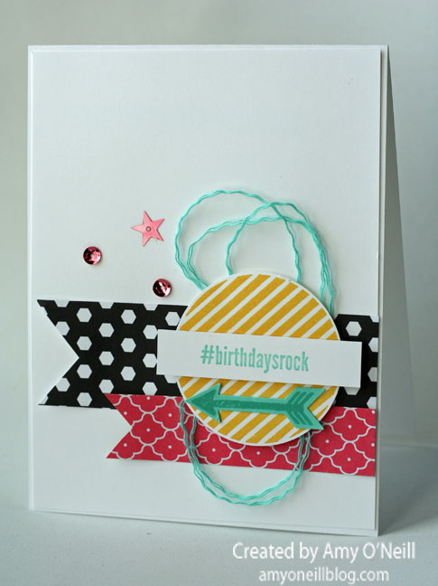 The striped circle and sentiment come from the #hello stamp set (I love this set so much!) and the arrow came from the What’s Up stamp set (which has a coordinating arrow punch).