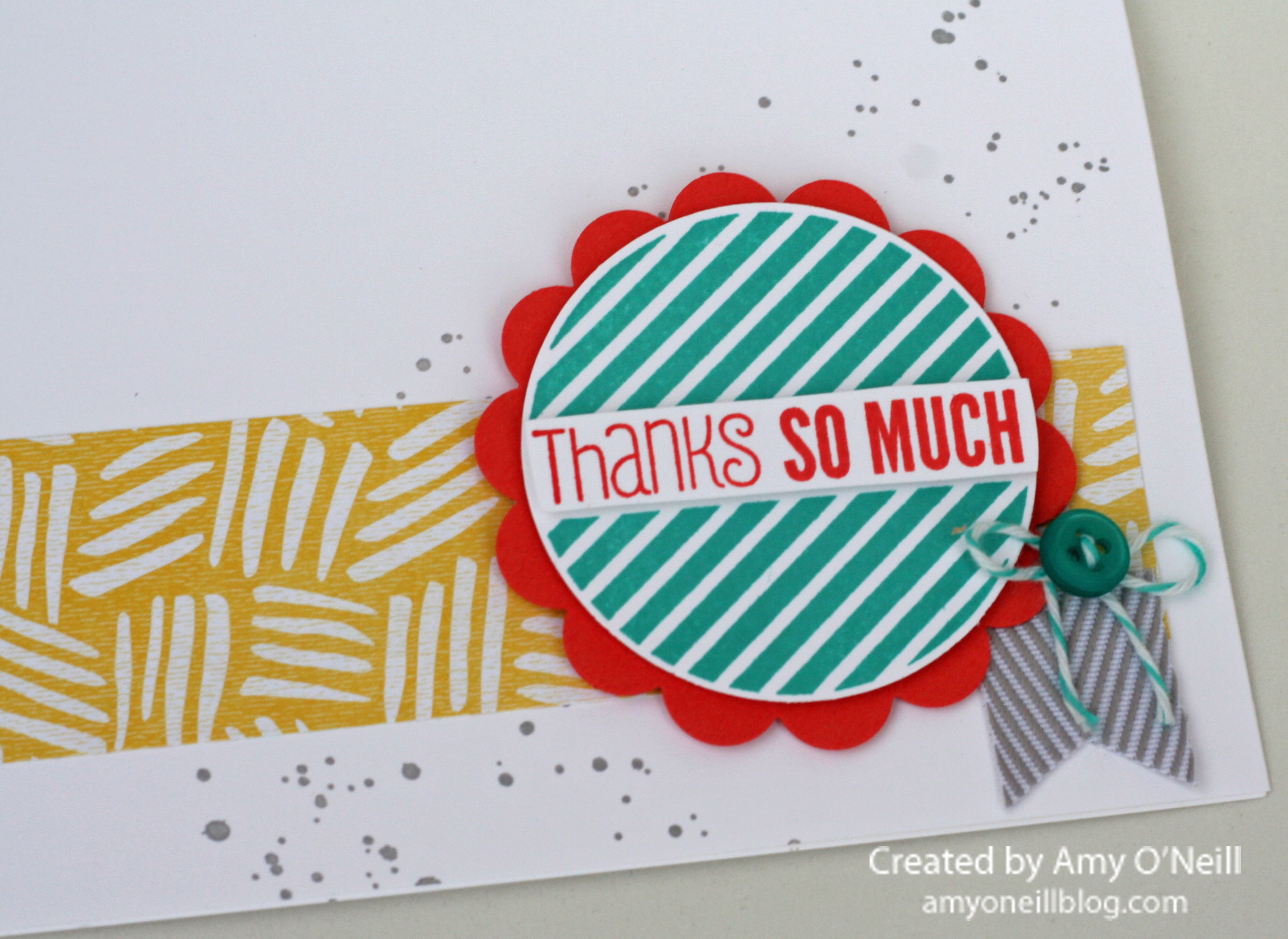 Thanks from K close upI used Gorgeous Grunge and Smoky Slate to make the background splatters.  I also added a little button and bow to make it a little “girly”.  The dsp is from the Sale-a-Bration catalog and is called Best Year Ever.