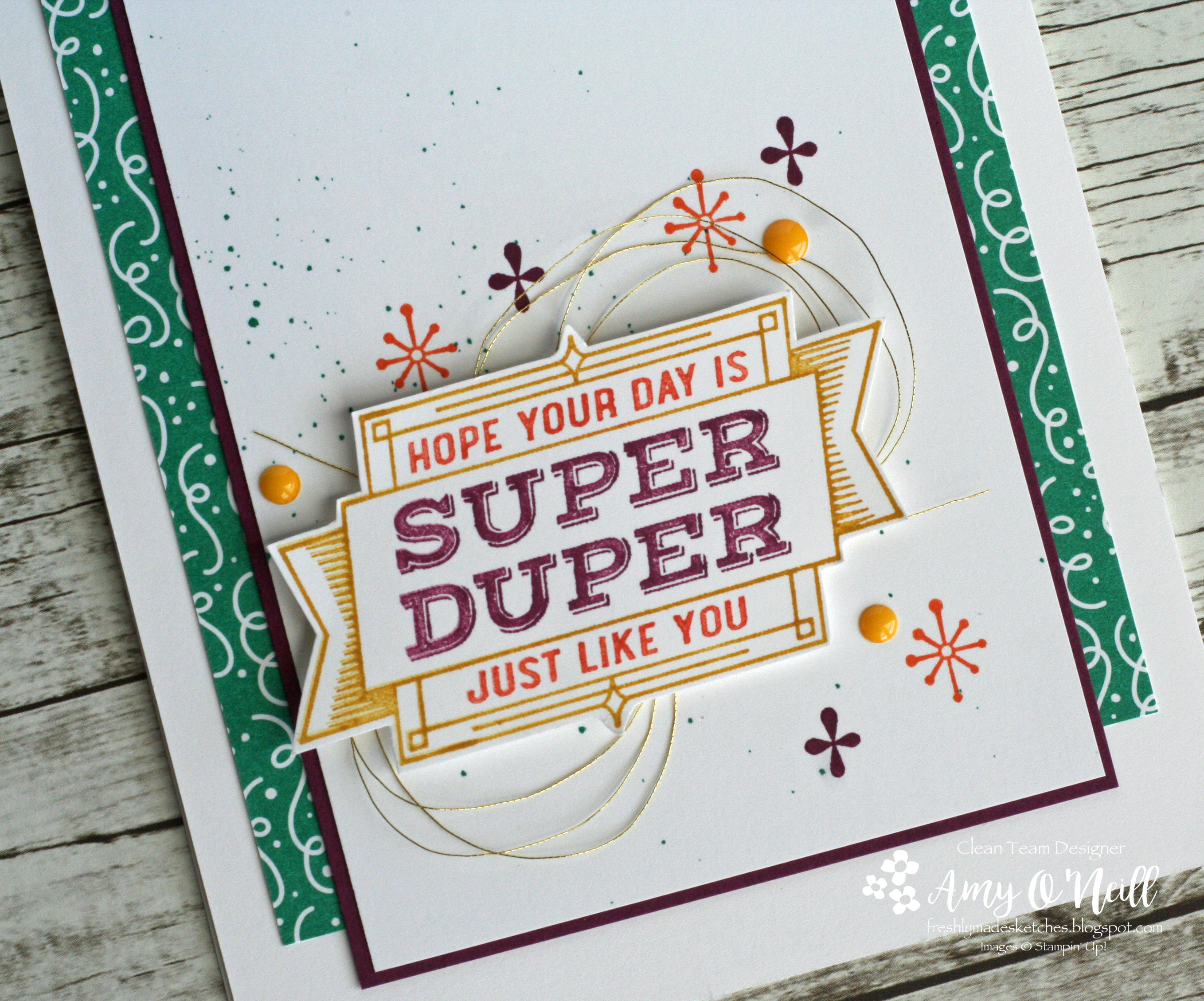 I recently acquired the Super Duper stamp set and wanted to get it inky.  Since any shape can be substituted for the star in the sketch, I chose to use one of the images in the stamp set for the focal image.