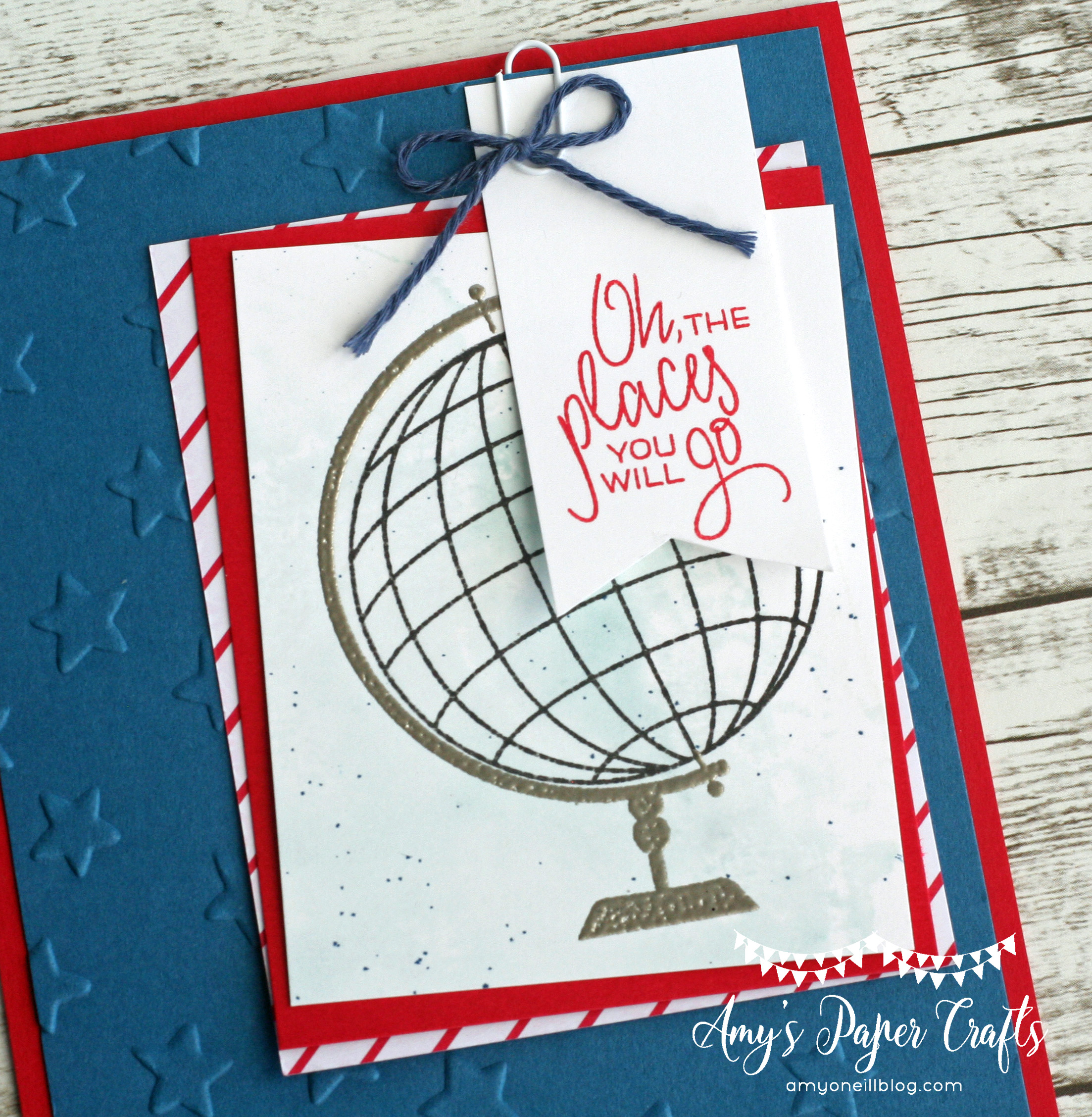 The Luck Stars embossing folder (also retiring) was used on a piece of Dapper Denim cardstock, and a little piece of dsp from the Sending Love dsp stack was also added for a bit of a fun pattern. The cute little paper clips and the Night of Navy baker’s twine will also be retiring.
