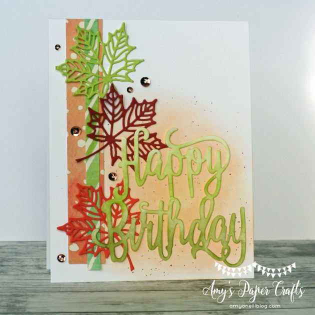 Now that it is officially Fall (in the calendar sense only here), I thought it was appropriate to start making Fall themed birthday cards.  It seems like we know a lot of people with October birthdays.  I love the beautifully detailed leaves in the Seasonal Layers Thinlits Dies, so I cut some out in Fall colors (Lemon Lime Twist, Cajun Craze, and Tangerine Tango).  There is no stamping on this card — just die-cutting.