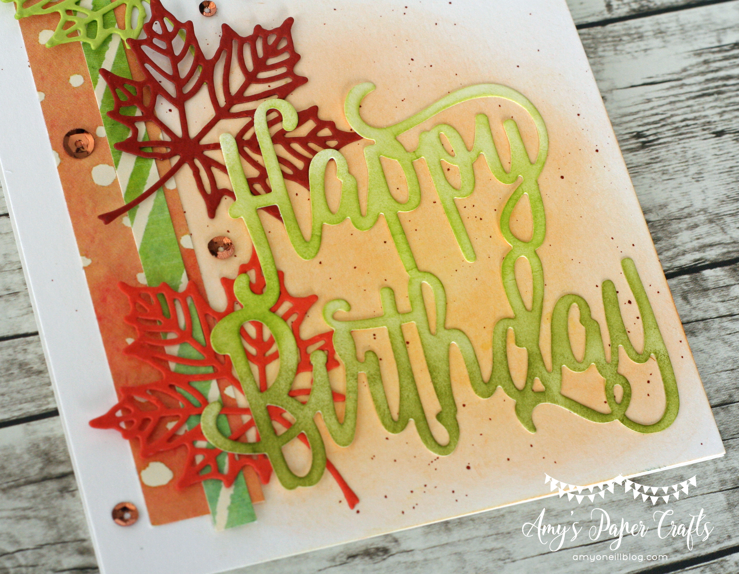I cut the sentiment with the Happy Birthday Thinlits Die from Whisper White card stock and sponged on some Lemon Lime Twist and Old Olive inks.  On the background, I sponged some Pumpkin Pie and Crushed Curry inks and added some Cajun Craze splatters.