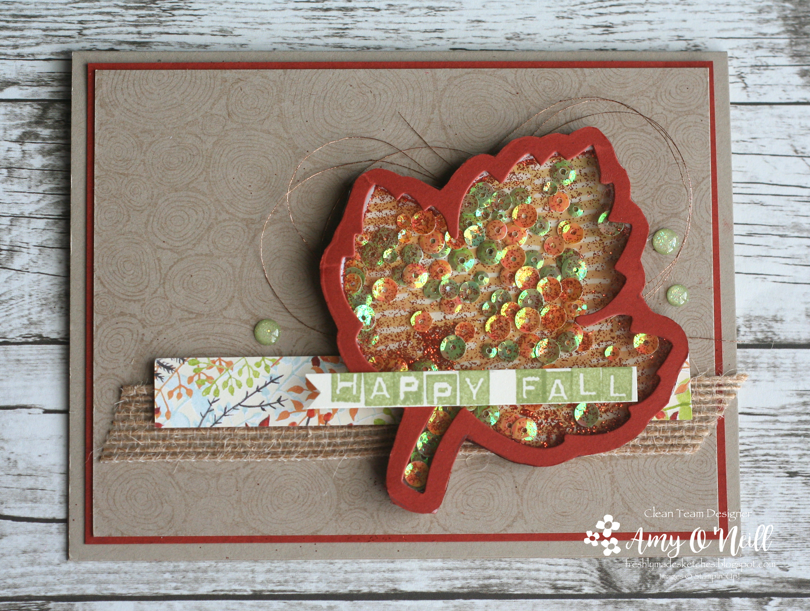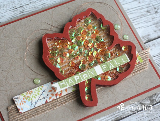 Going with a Fall theme, I decided to substitute the circle shape for a leaf.  I took a piece of Cajun Craze card stock and laid the leaf framelit down on it, tracing with a pencil around the outside of the framelit.  I ran it through the Big Shot and then fussy cut the penciled outline with my paper snips.  I used a piece of Painted Autumn dsp for the background of the leaf and filled the shaker with some Iridescent Sequins and some orange glitter I had on hand.