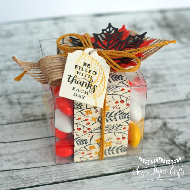 I started by wrapping a strip of Painted Autumn dsp around a Clear Tiny Treat Box. I then adhered a piece of burlap ribbon and the leaves, made with Tangerine Tango and Early Espresso card stock. Some Crushed Curry Baker’s twine was wrapped around the box, and I tied on a tiny tag made with the Lots of Labels Framelits Dies (I cut off the bottom) with some Linen Thread. The stamps on the tag came from the last Paper Pumpkin kit.