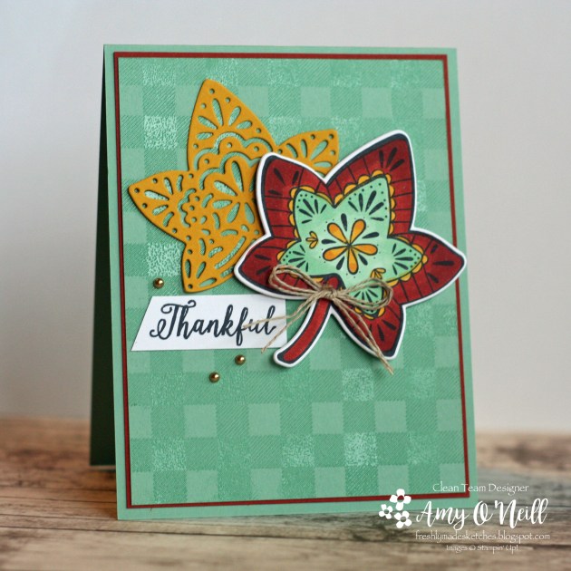 While trying to decide what to use for the circles in the sketch, I uncovered an unused leaf from the Falling for Leaves stamp set that I had stamped over a month ago but hadn’t colored.  Thinking leaves would work with the sketch, I pulled out my markers and got to coloring.