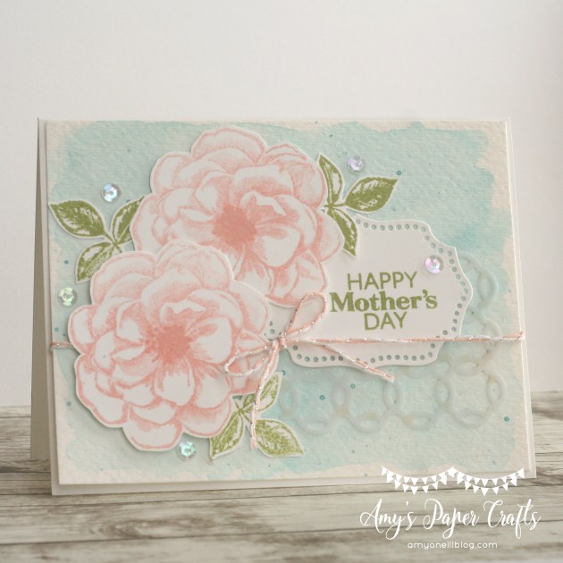 I started with a piece of watercolor paper and applied a watercolor wash of Balmy Blue ink. The flowers were stamped with Powder Pink ink and the leaves with Pear Pizzazz ink.