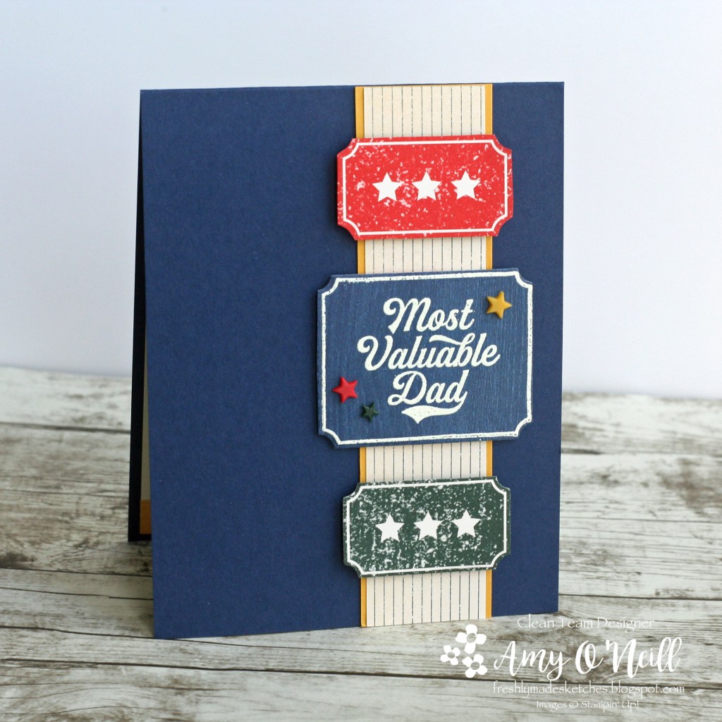When I first saw the three focal rectangles in the sketch, I immediately thought of the ticket die in the Hey Sports Fan suite. With that as my starting point, another Father’s Day card seemed appropriate.