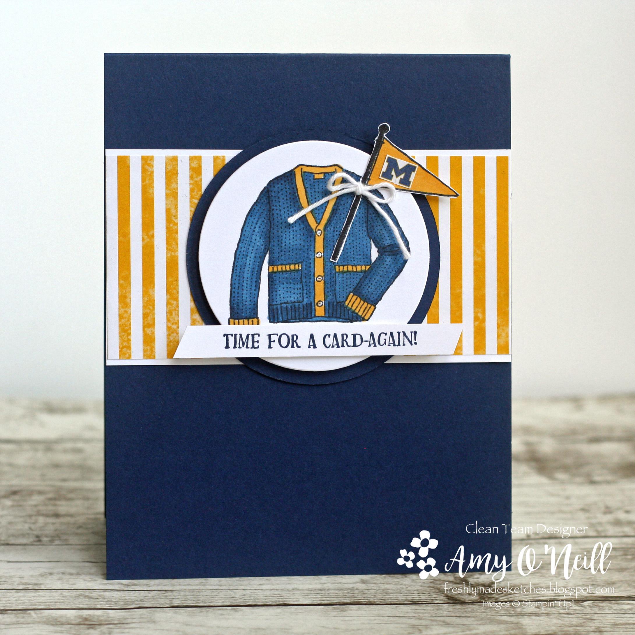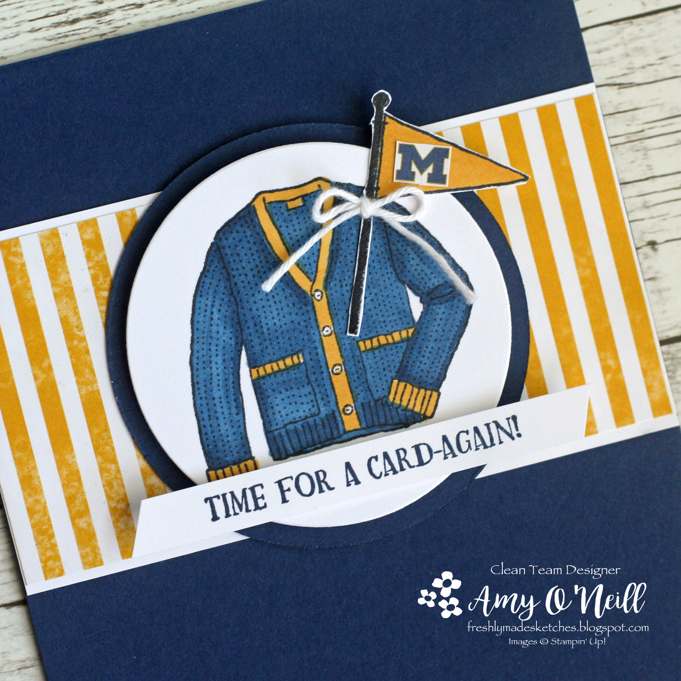 I wanted to make a little care package for my college daughter, and I always have to include a card in the box. When I saw the cute sweater in the Forever Friendship stamp set, I thought it could be a college letterman’s sweater. Do they even make those anymore?? While I didn’t include a sweater just like what’s on the card, I did include a cardigan in her package.