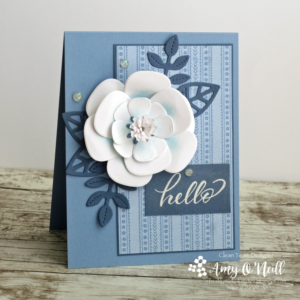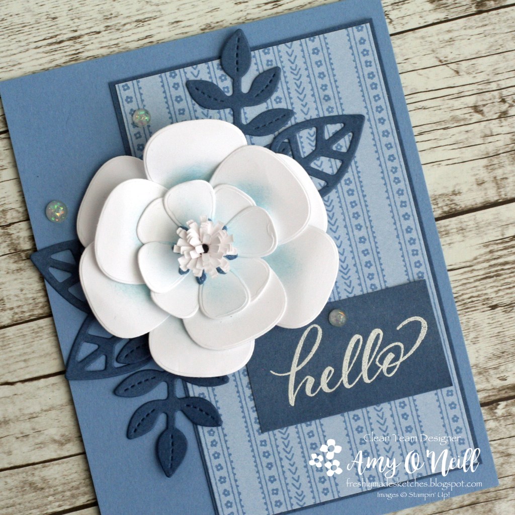 This is such a sweet card! I love that big flower! It’s so pretty! Love the hints of blue! Blue and white cards are always some of my favourites! Thank you for a fun sketch this week!