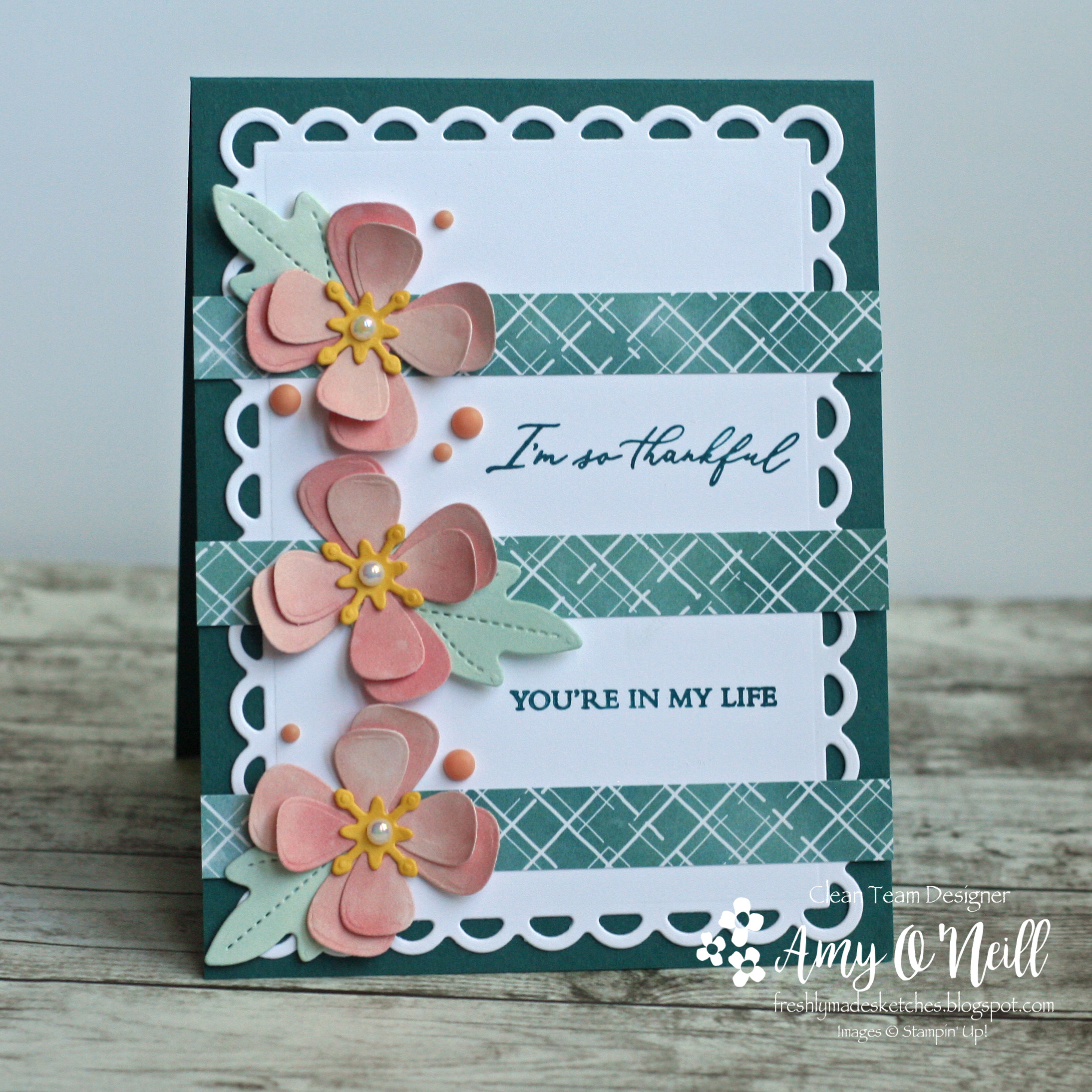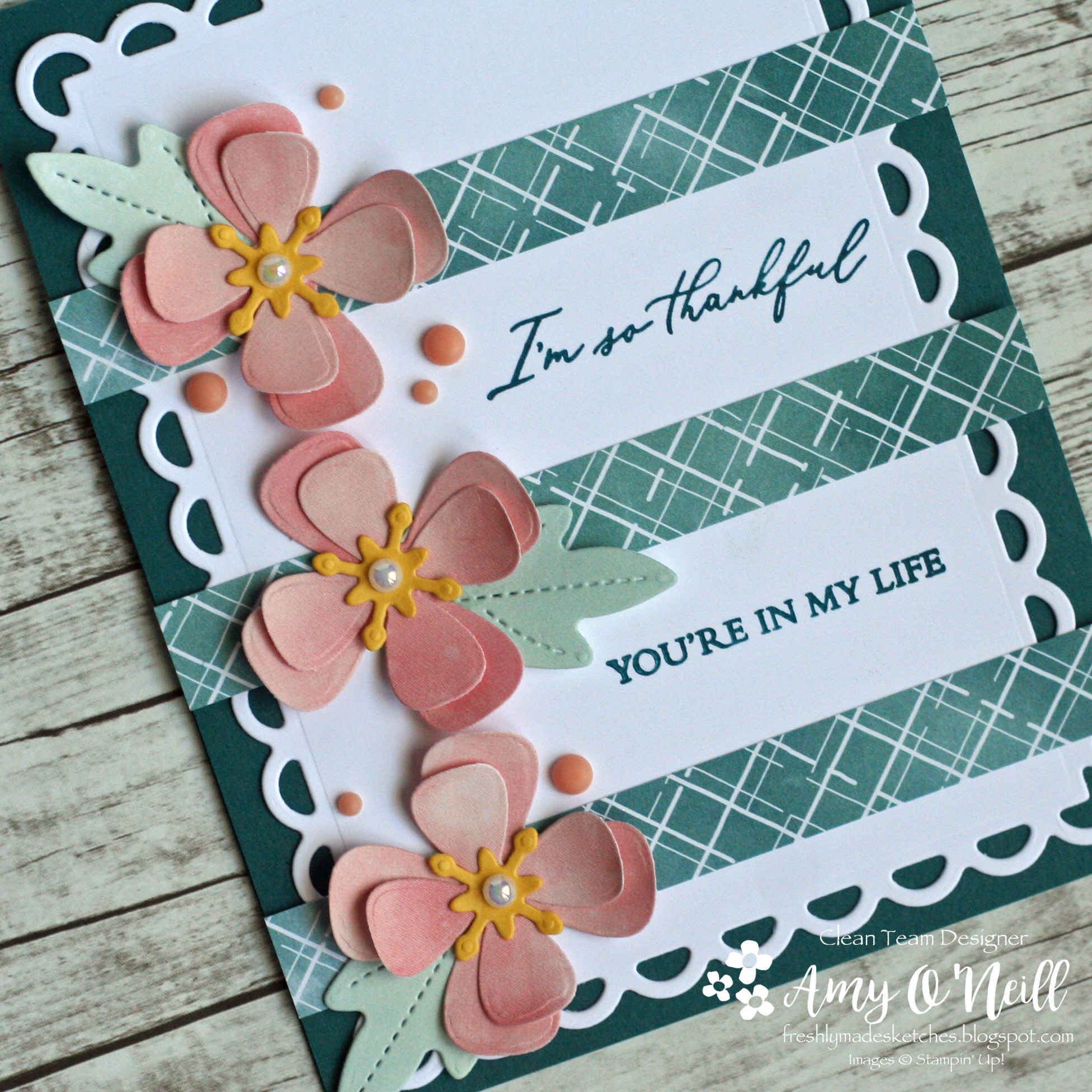 I love your use of this sketch with the lovely flowers and the sentiment tucked between the strips. The colors are gorgeous!