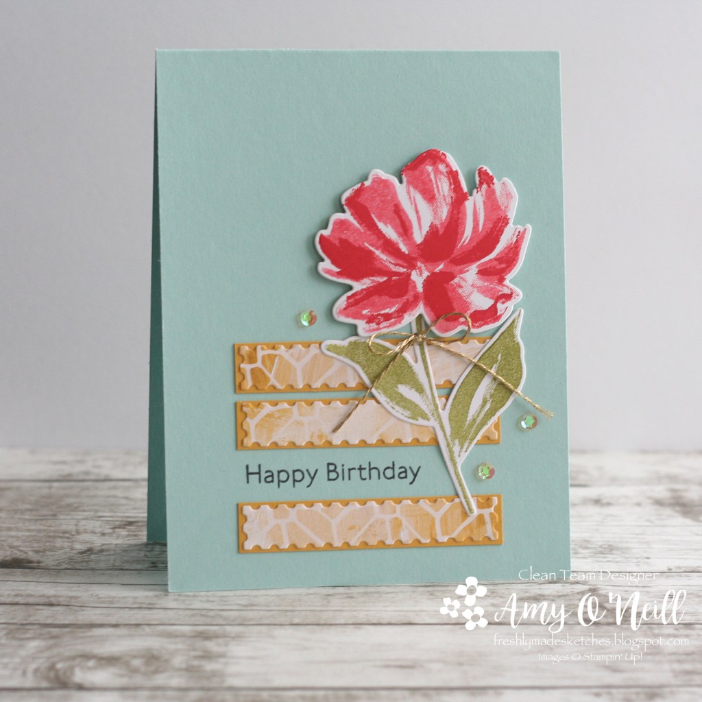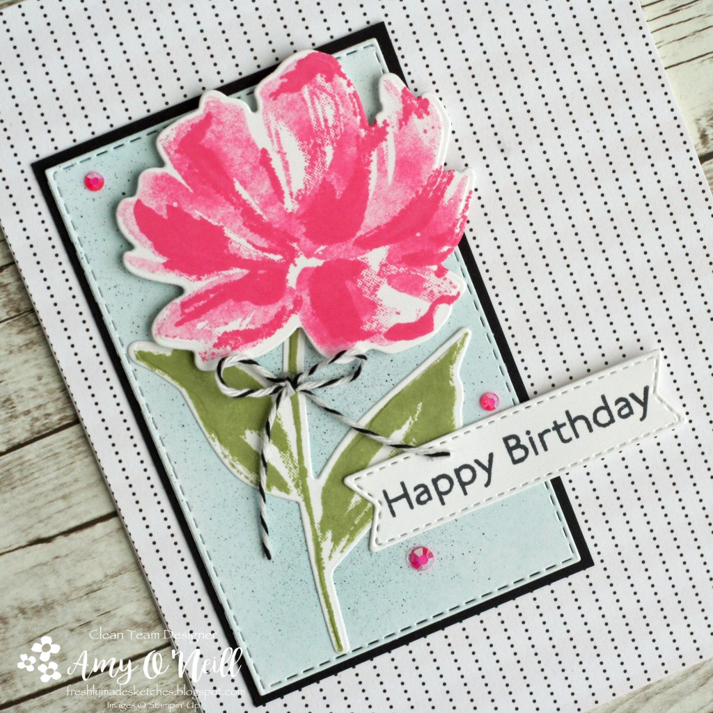 I started by stamping the flower from the Art Gallery stamp set and cutting it out with the coordinating dies. I sponged some Balmy Blue ink onto some white card stock, cut out a piece with a rectangle stitched die and splattered some black ink on it. Some fun In Color Jewels were added as embellishments.