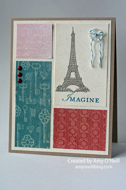 Embellishments: Pewter Embossing Powder, 3/16″ Regals Brads, Vintage Faceted Designer Buttons, Island Indigo Baker’s Twine