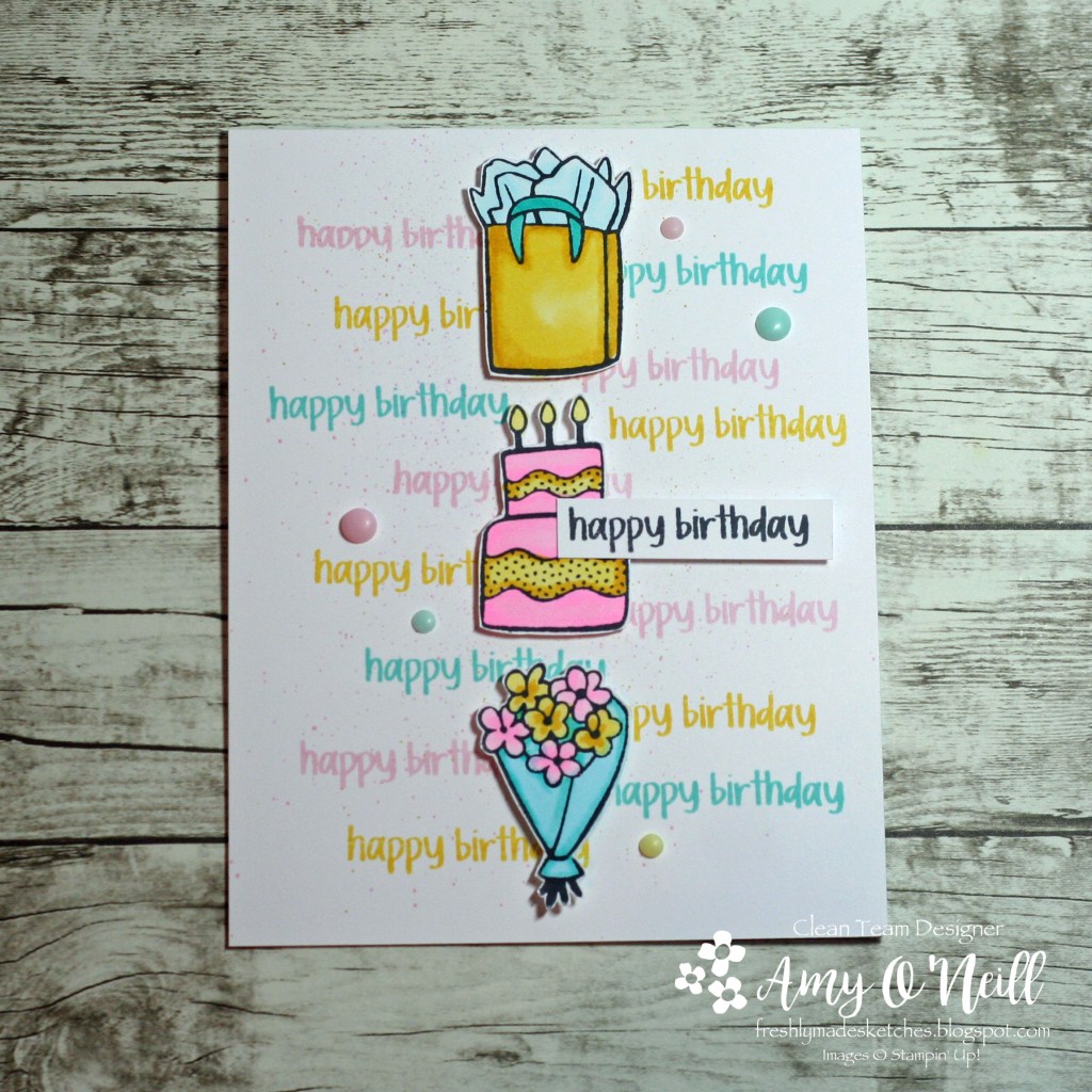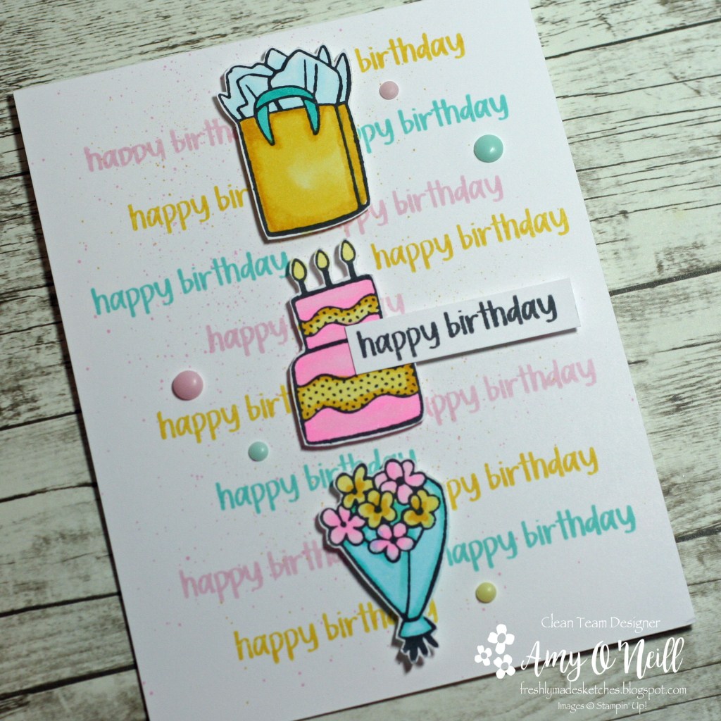 I started by stamping the sentiment multiple times in different colored inks on the card base, and then colored the images with my alcohol markers and popped them up with dimensionals. I added some Rainbow Adhesive Backed Dots and ink splatters to the background.