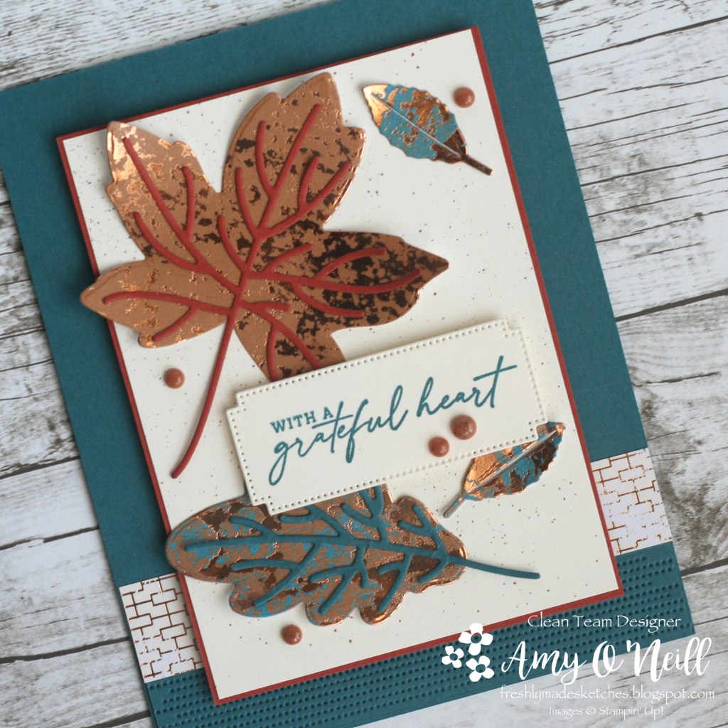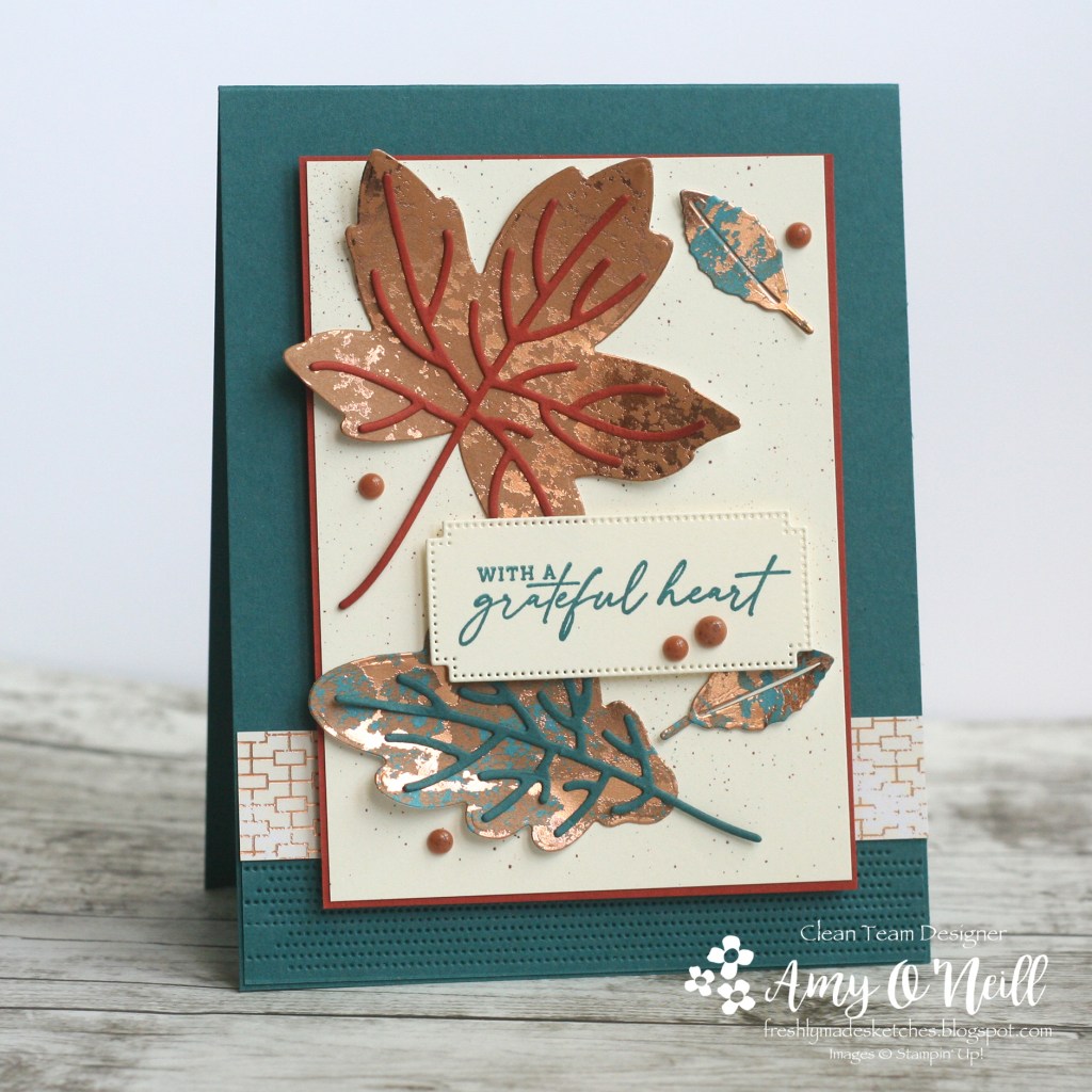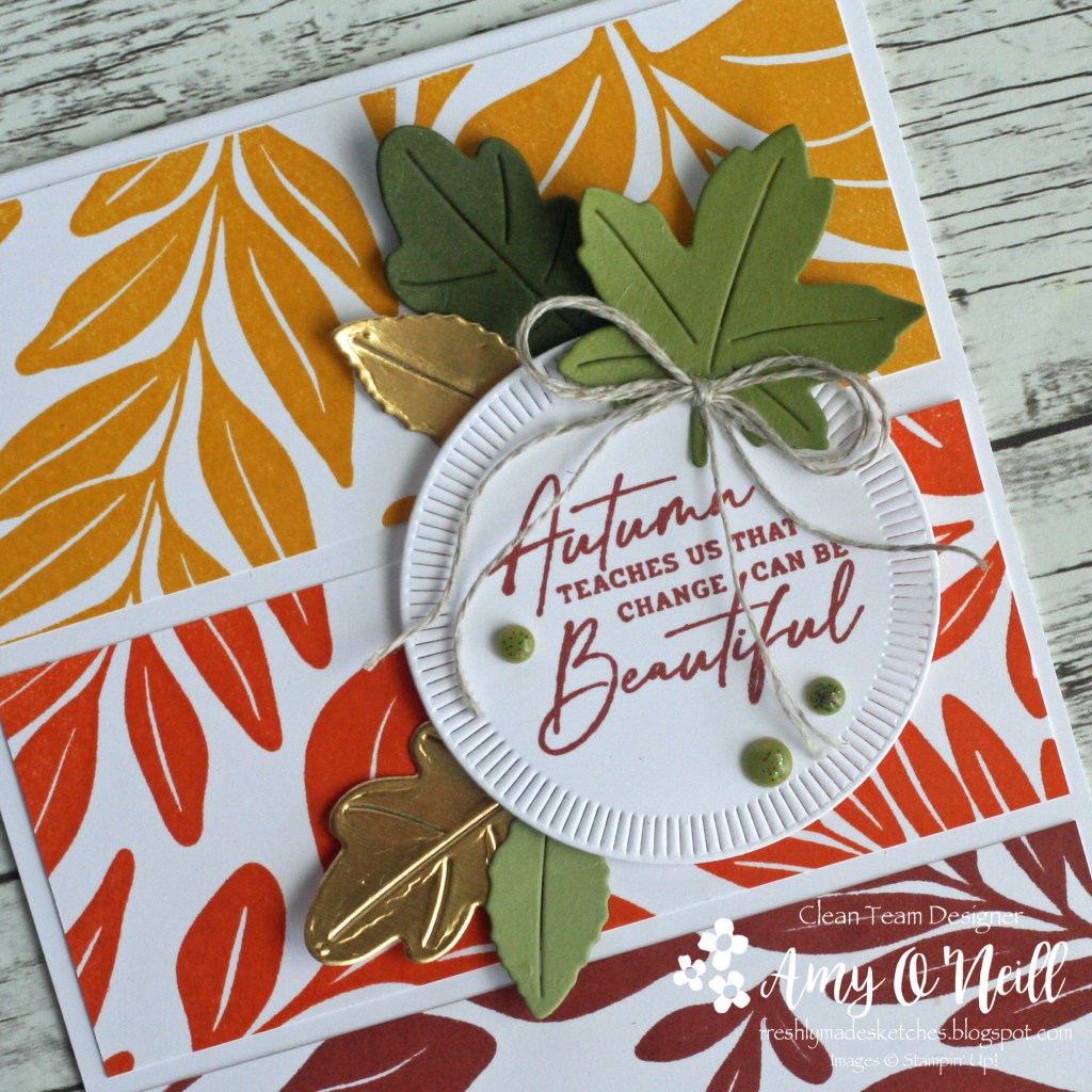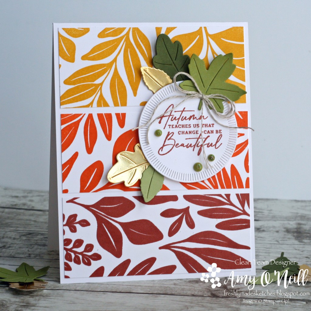 I started by stamping the background stamp, Leaf Collection, three times — in Crushed Curry, Pumpkin Pie and Copper Clay. I then cut them into three strips and placed them on the card base.