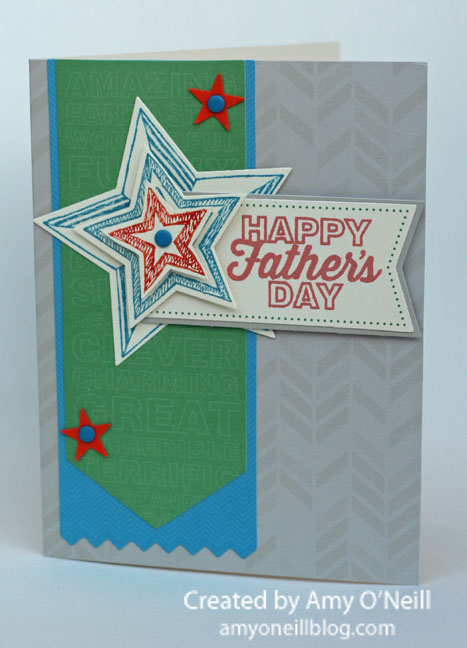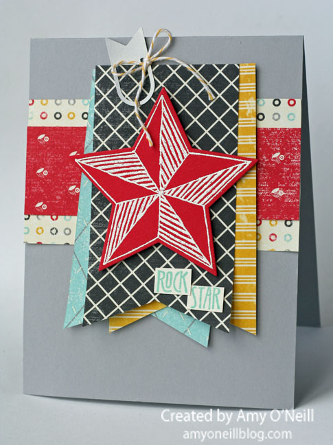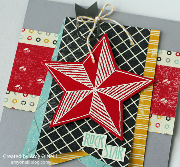 I stamped one of the stars from Be the Star with Versamark ink and embossed it with Whisper White Stampin’ Emboss Powder onto Real Red card stock. I then used one of the coordinating Star Framelits dies to cut it out.