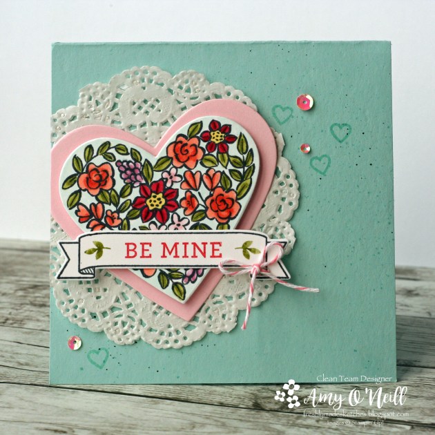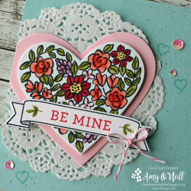 I adore the hearts in the Heart Happiness set, and the floral heart is my favorite so I decided that I needed to use it first. I stamped it with Memento ink and then colored it with Stampin’ Blends markers. A Pink Pirouette heart is an added layer between the focal heart and the the doily. The sentiment is from the Bloomin’ Love stamp set.