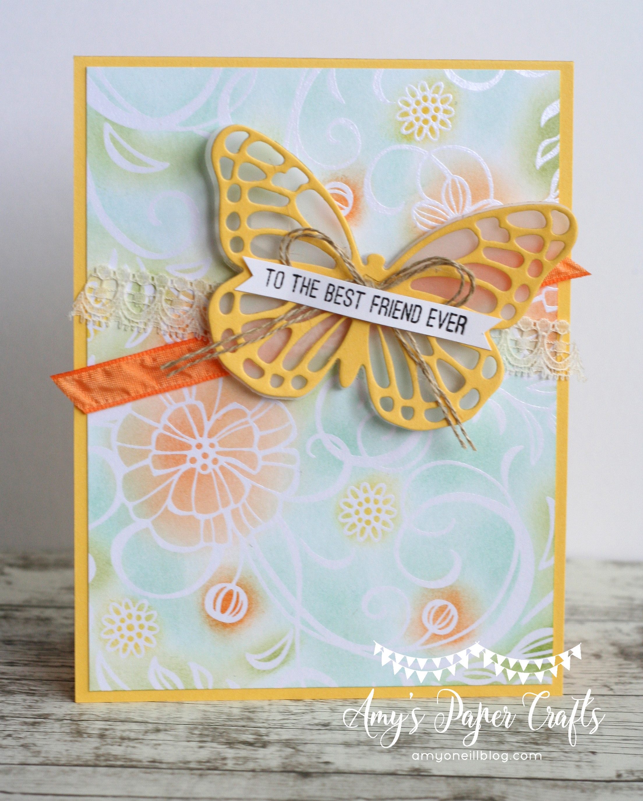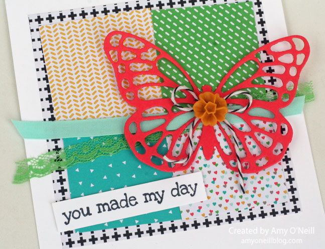 My kids start Spring Break this week. It seems a little early, but it has definitely felt like Spring here for a while as the temperatures have been unusually warm. I was making some thank you notes for my daughter recently and was inspired by the Spring-like weather so I pulled out my Butterflies Thinlits dies and Bold Butterfly Framelits dies. My daughter is a lover of yellow and orange — she likes happy colors, so I tried to use those as my focal colors.
