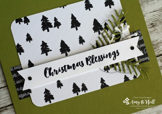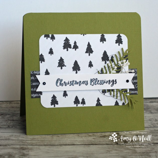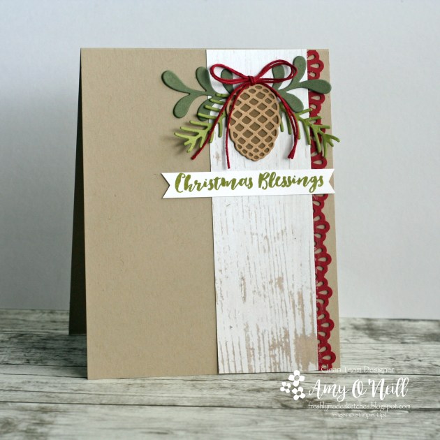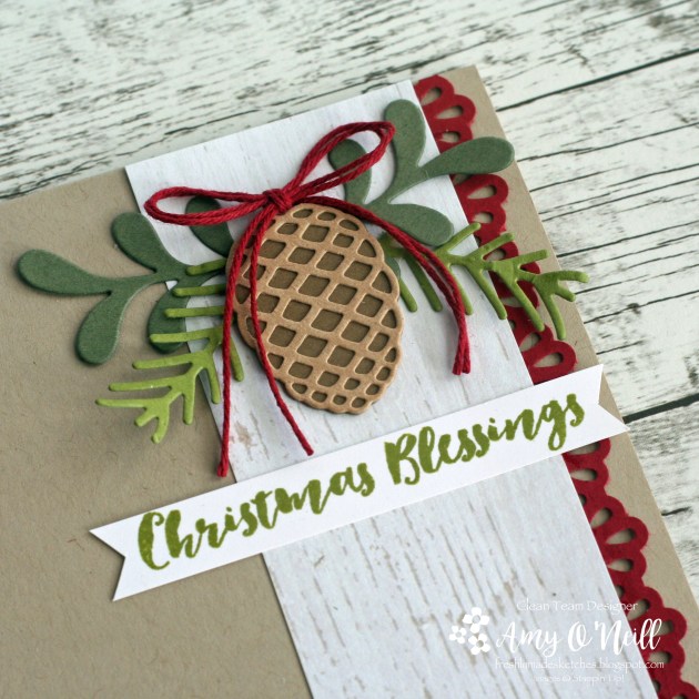The greenery was die-cut using the Pretty Pines Thinlits dies, from Mossy Meadow, Old Olive and Cherry Cobbler card stock. A piece of Festive Farmhouse dsp was attached to the card base.