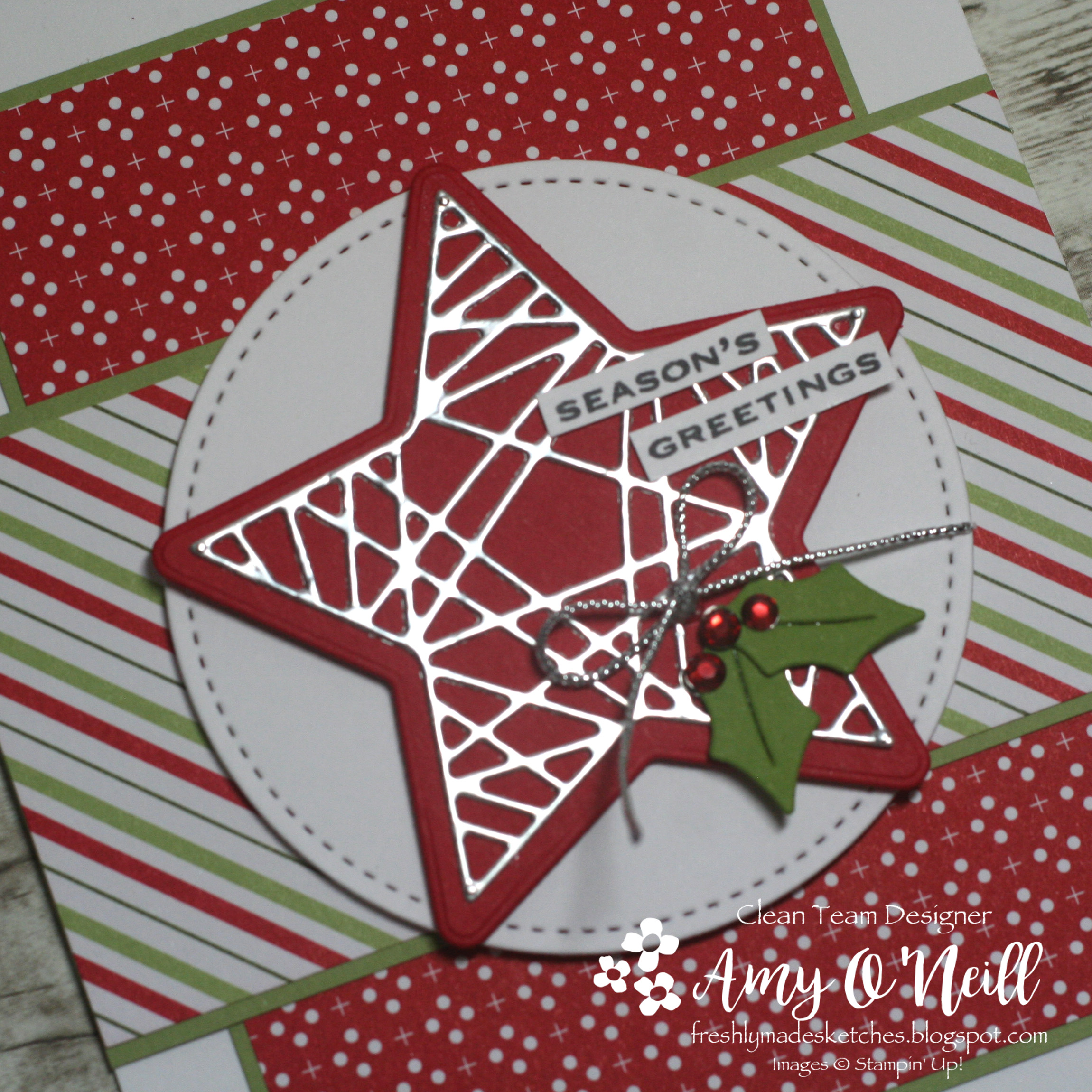 I pulled out the Merriest Moments stamp set and embossed the image using some old Cherry Cobbler embossing powder, and cut it out with a circle die. I placed it on a square I cut from some of the Lights Aglow dsp, and placed that on a square of gold glimmer paper, which was placed on another sheet of dsp from that collection.