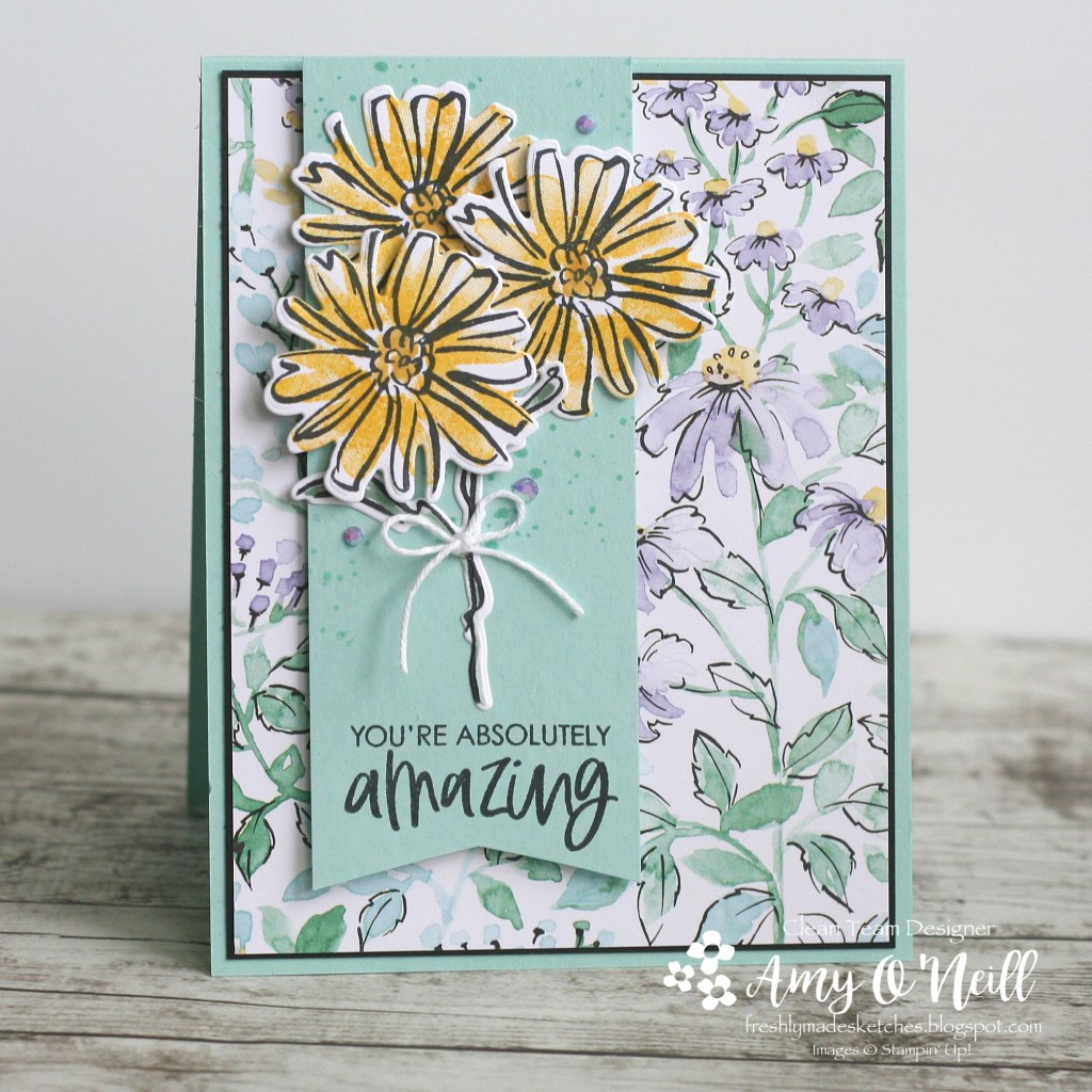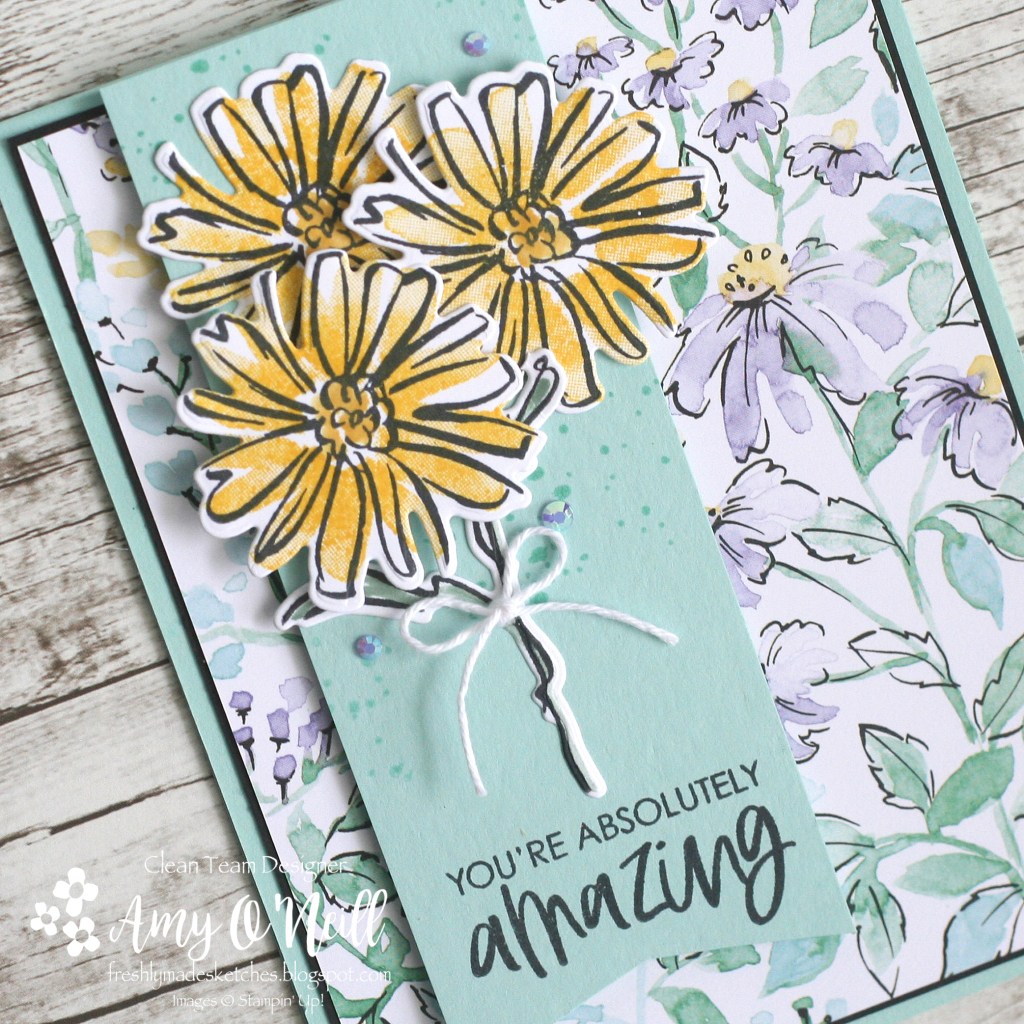 I then stamped some flowers from the Color & Contour Stamp set and added some pretty In Color Jewels and a little Baker’s Twine bow. The sentiment is also from the same stamp set.