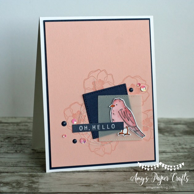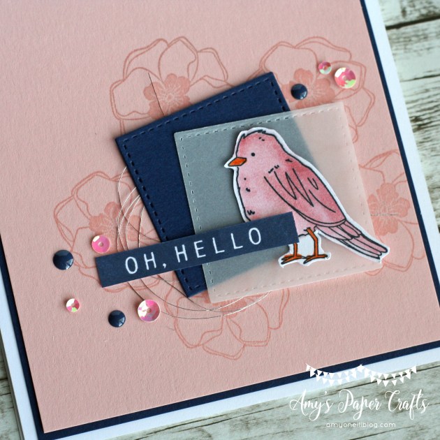 I started by stamping the floral image randomly around where I wanted to place the focal image. I used Powder Pink ink on the same color of card stock. I then cut out two stitched shapes squares — one from Night of Navy card stock and the other from vellum. The sweet little bird was stamped on Thick Whisper White card stock with Memento black ink and colored with the Stampin’ Blends markers.