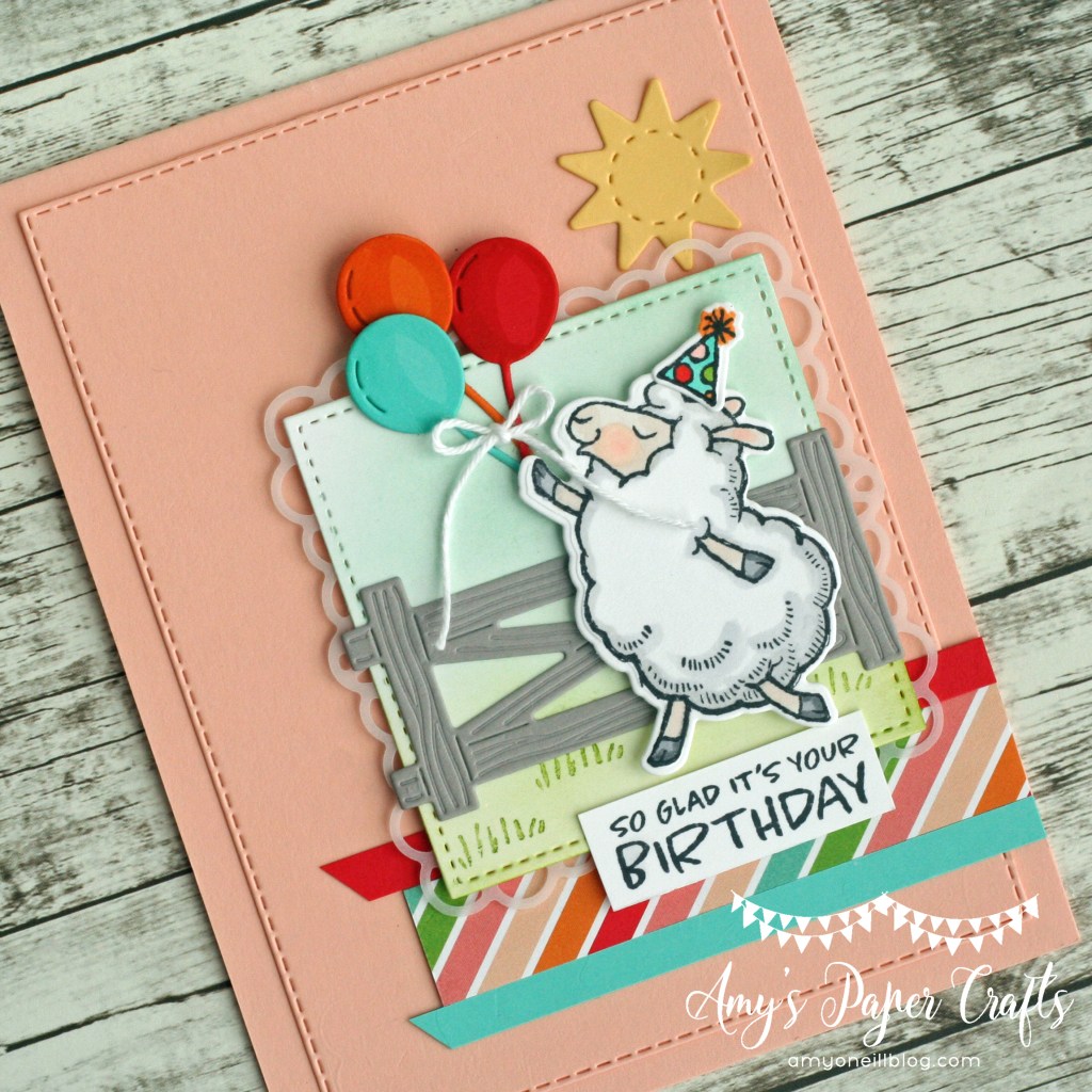 I started this fun card by using a blender brush to apply some Pool Party and Granny Apple Green inks to a piece of white card stock. I then stamped some of the grass using a stamp in the Counting Sheep stamp set. I stamped the sheep and hat and colored them with my alcohol markers, and cut them out with the Sheep Dies. The fence was also cut using the dies from a piece of Gray Granite card stock. I love the texture this die provides on the fence!