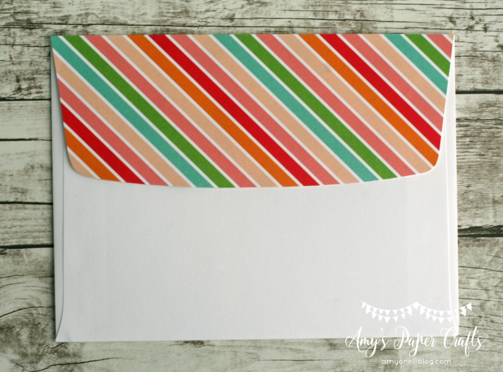 Because I love this paper so much and I do like to decorate the envelopes a little bit too, I used some of the dsp on the envelope flap. I just cut a strip of paper big enough to cover it and then used my paper snips to trim around the edges. It’s a 2 minute step that adds a lot of fun to the mail.