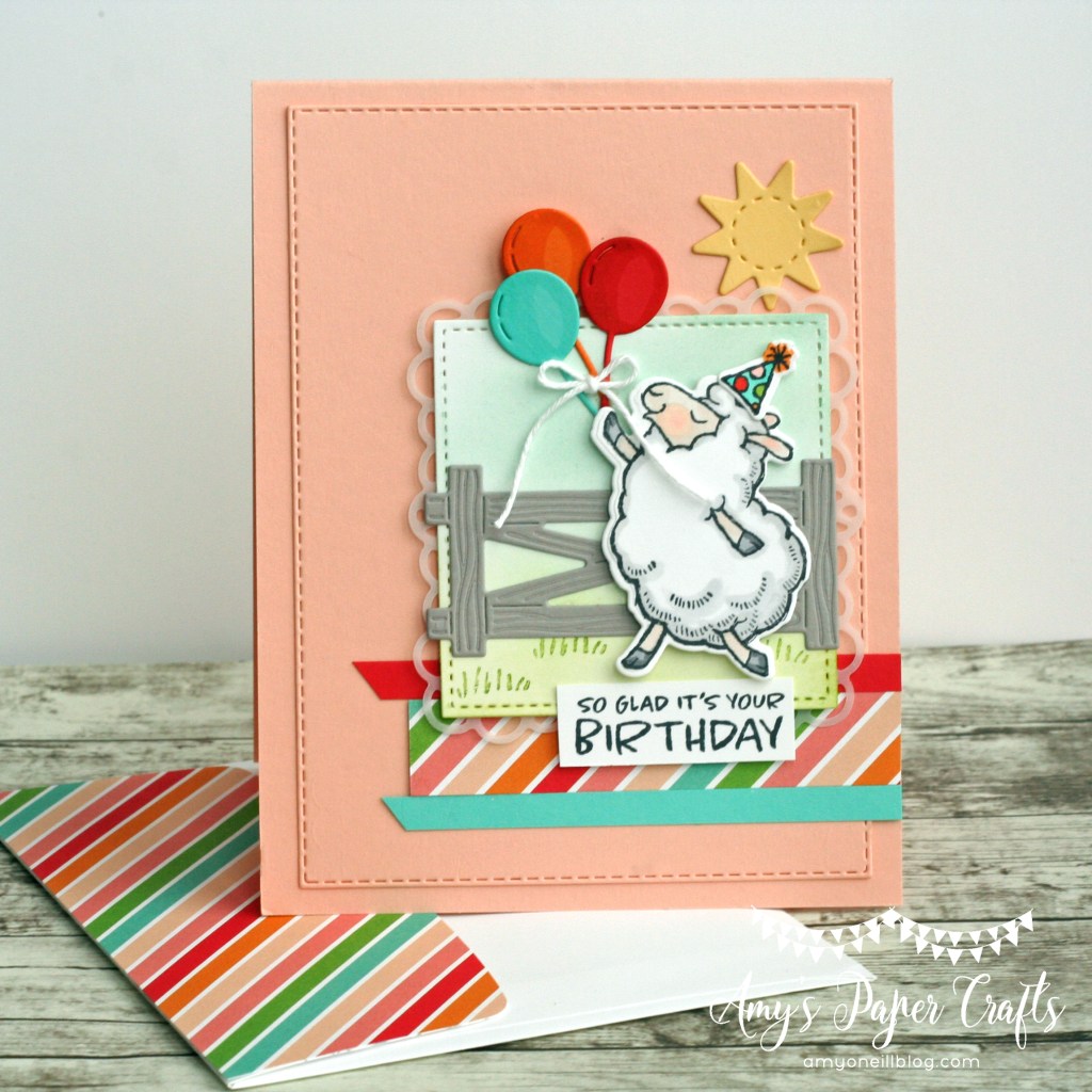 Some strips of Poppy Parade and Coastal Cabana card stock and a piece of dsp from the Pattern Party collection were added to the card base. A Square Vellum Doily was added underneath the focal image, and some balloons and a sun, which were also cut using dies from the Sheep Dies set, were added to make the card more festive.
