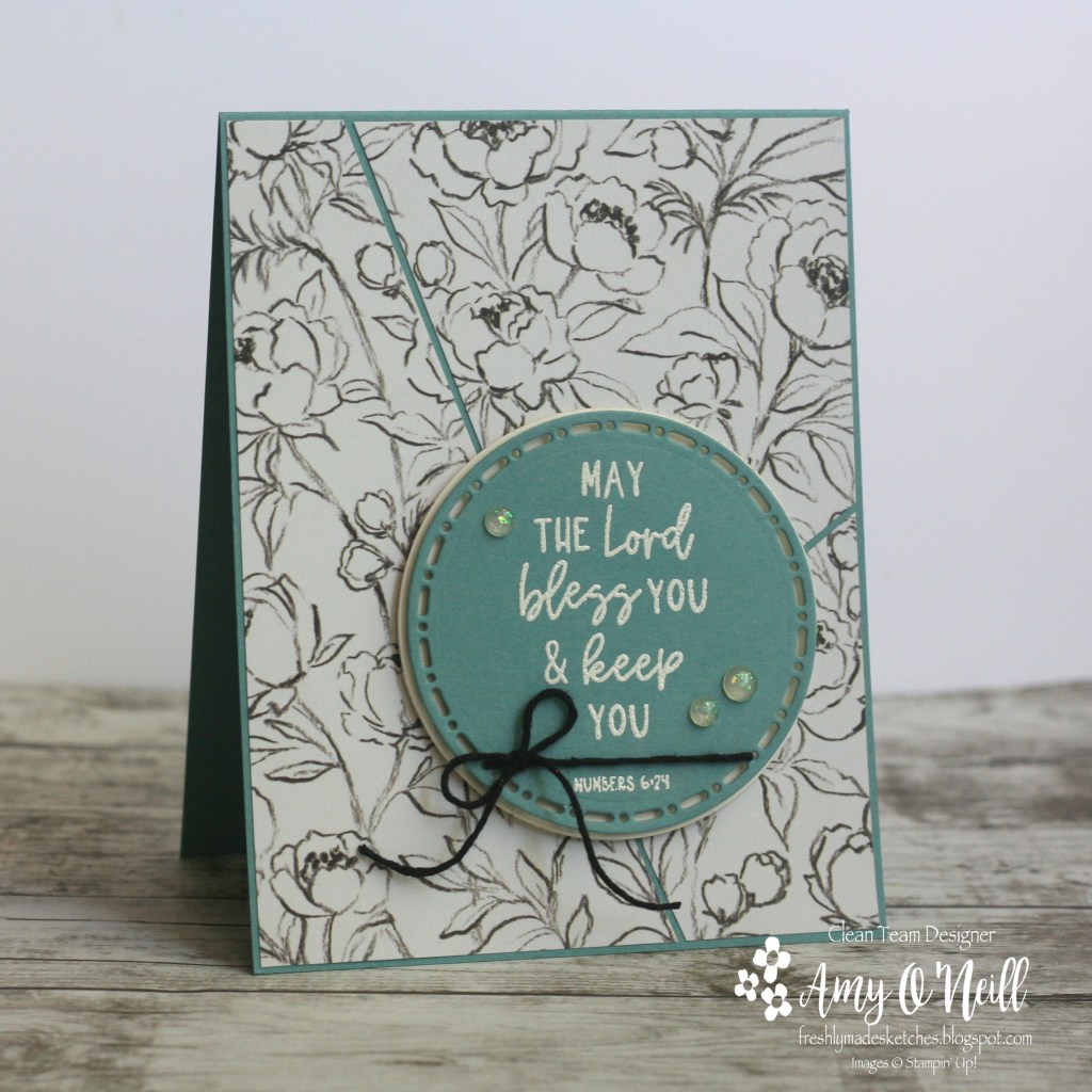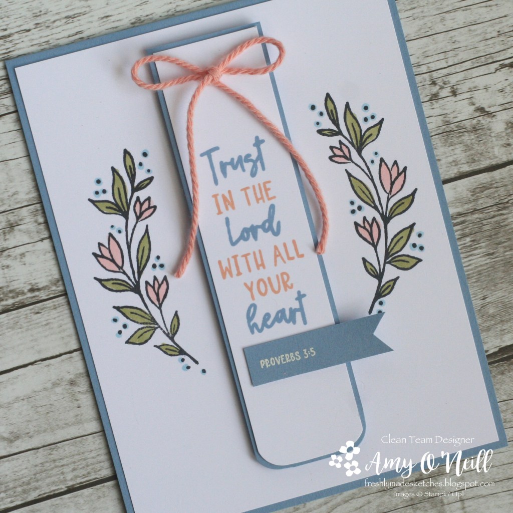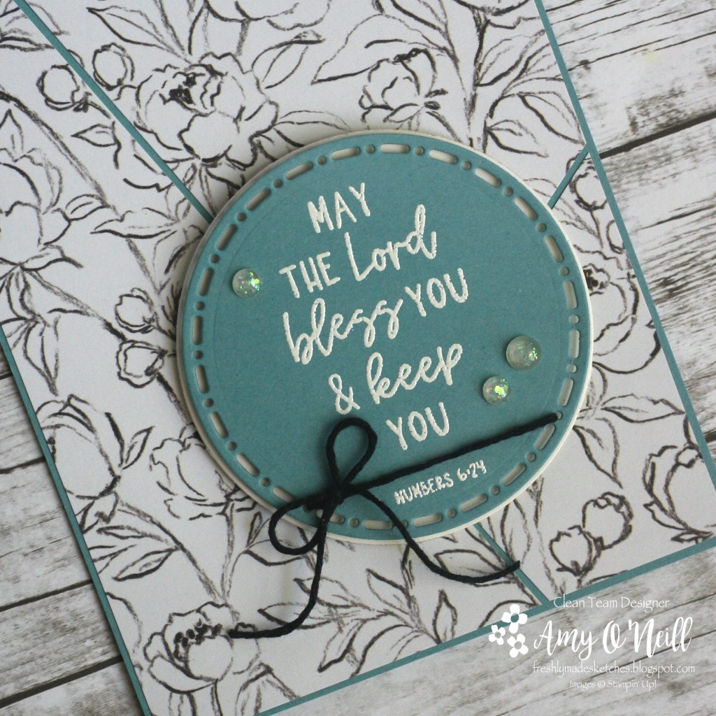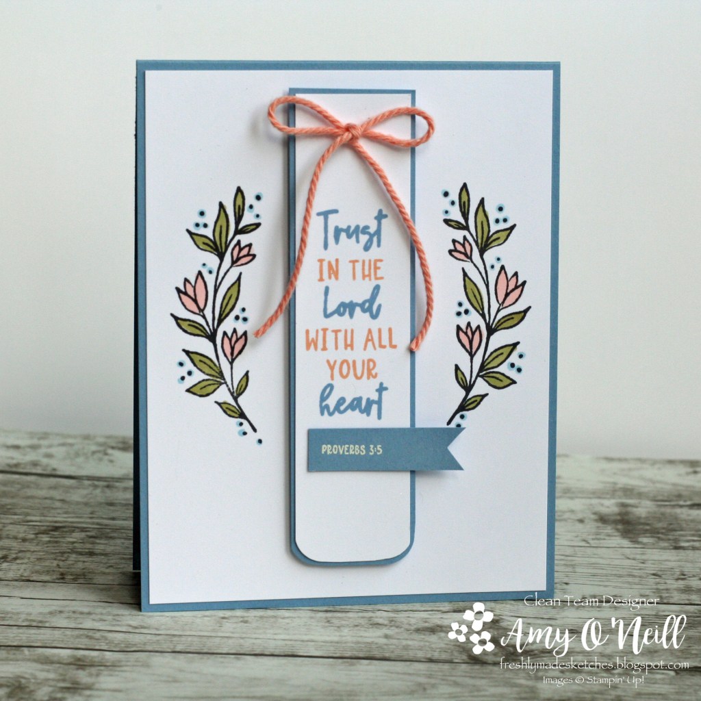The sentiment and focal image is from the Courage & Faith stamp set. I embossed it on a piece of Lost Lagoon card stock, which is also used for the card base, and cut it out with a die from the Spotlight on Nature Dies collection.