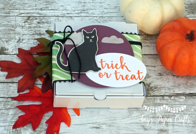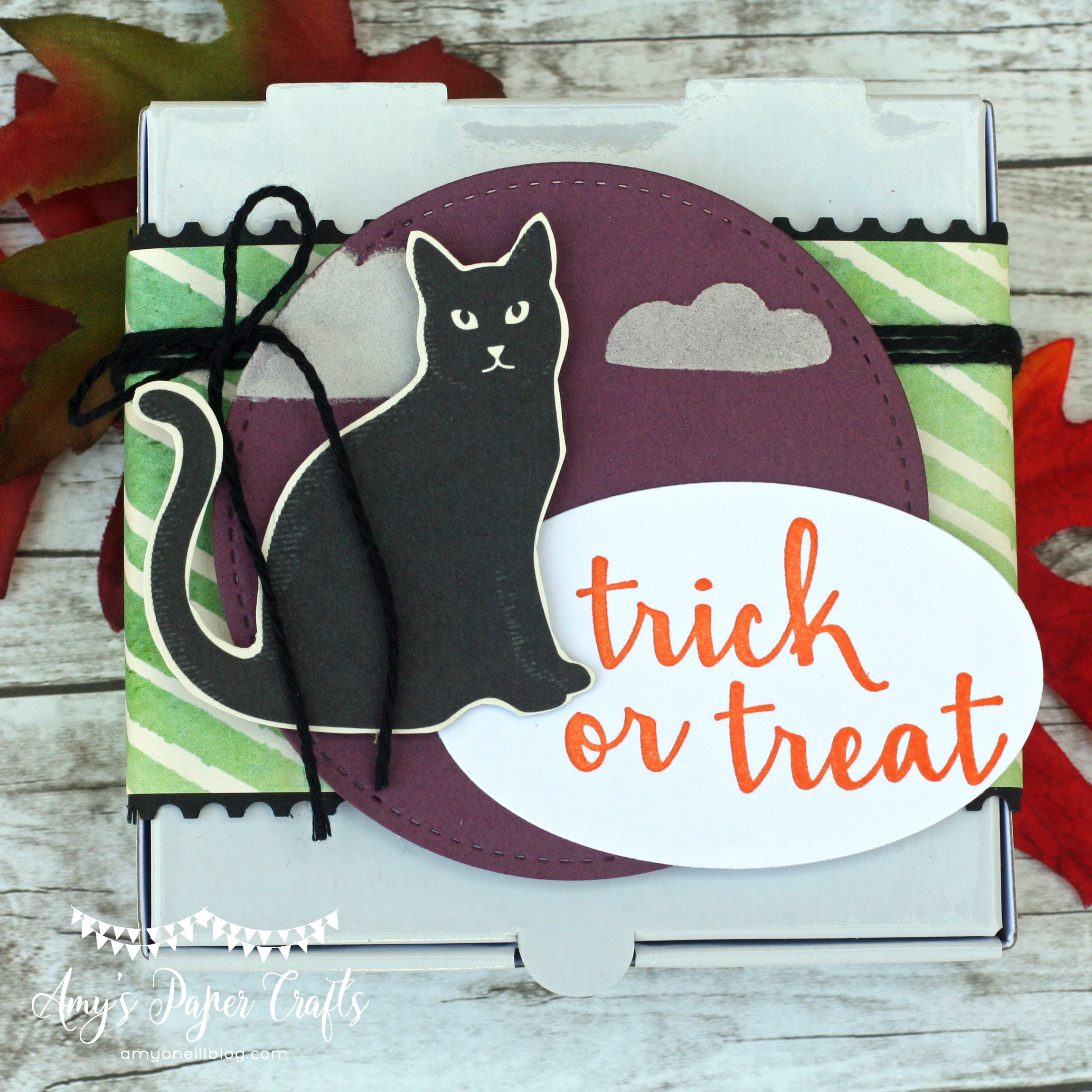 I started this one by wrapping a strip of Printed Autumn dsp, edged with some Basic Black card stock punched with the Ticket Tear Border Punch, around the box. Some embossing paste was applied to a Fresh Fig Stitched Shapes circle using a stencil from the Pattern Party Decorative Masks. The cat was cut from the Spooky Night dsp, and the sentiment is from the Creep It Real stamp set.