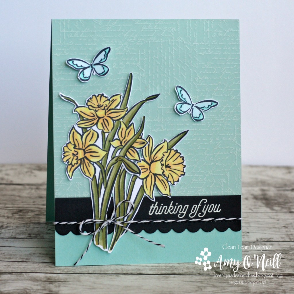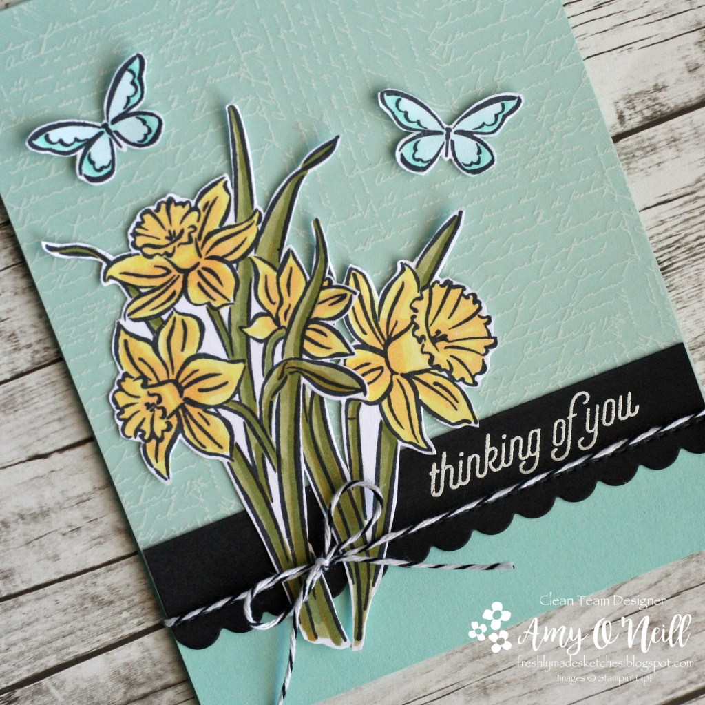 For the vertical strip, I decided to use a new stamp set, Daffodil Daydream. I stamped the daffodils and butterflies and colored them with my alcohol markers before cutting them out. I then adhered them to a piece of patterned vellum from the Vellum Layering Designs collection.