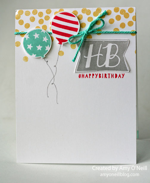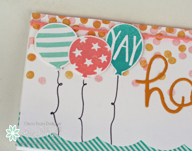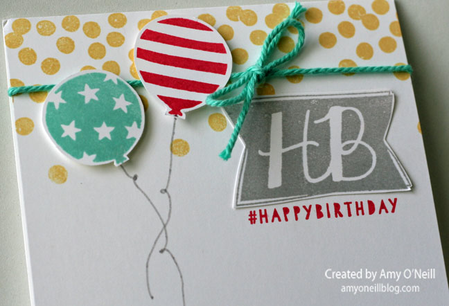I ended up using three different stamp sets for this card — Dotty Angles, Balloon Bash and Crazy About You. I also pulled out lots of ink pads — Bermuda Bay, Blushing Bride, Crisp Cantaloupe, Pool Party, Hello Honey and Memento Black.