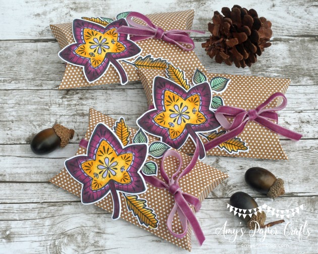 I started by assembling the Kraft Pillow Boxes, which are cute and super easy to assemble. You don’t even need any adhesive. I then stamped some of the leaves from Falling for Leaves, which is now available in the Holiday catalog, using Memento black ink on thick white cardstock. I colored them with my markers, and die cut them with the coordinating framelits.