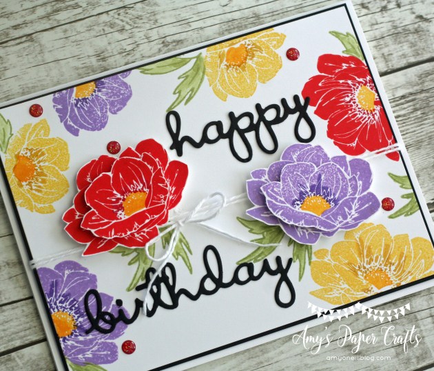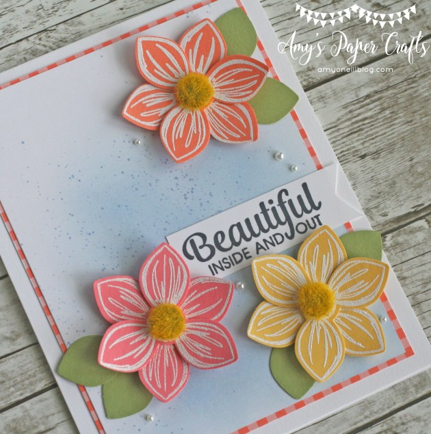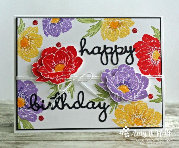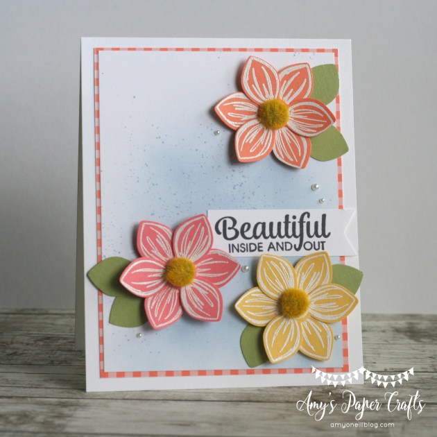 I wanted to make some bright, pretty flowers so I decided on a color combo of Daffodil Delight, Poppy Parade and Highland Heather. I added some slightly darker shades of these colors with Stampin’ Write Markers around the flower centers to add a little depth. The dies from the Well Written collection were used for the sentiment.