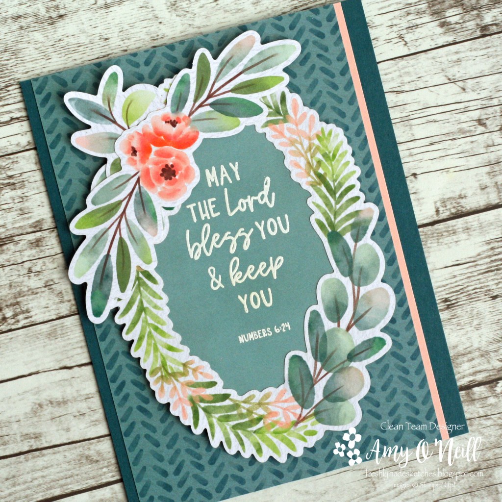 I started with a Pretty Peacock card base and then cut out a strip of Petal Pink card stock to go under one side of a piece of the Frames & Flowers Specialty DSP. This dsp kit has some coordinating die-cut images, and I used three of those to assemble the floral wreath.
