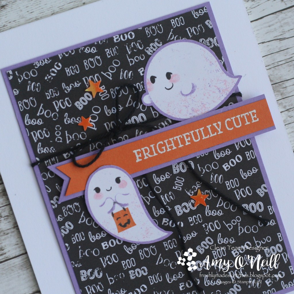 I started this one by cutting out the three squares and used the Stitched with Whimsy Dies to add a little stitching around them. I stamped and embossed the sentiment from the Frightfully Cute stamp set. All of the stamped images and sentiments came from this set. In fact, I used every single image while making this card! I never do that! It was fun doing all of that stamping — except for when I stamped this sentiment as my very last step and discovered I placed it a little too high. Oh well! I wasn’t starting over!