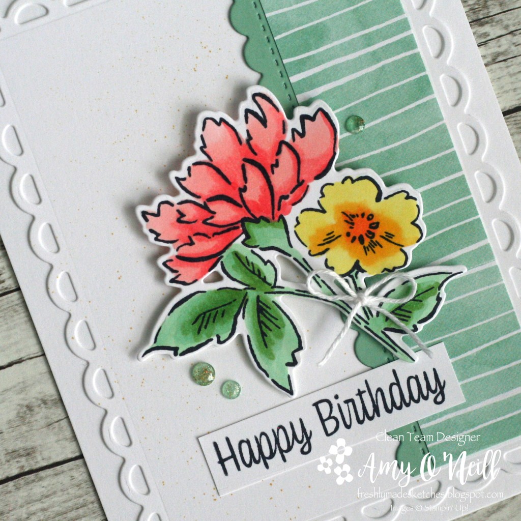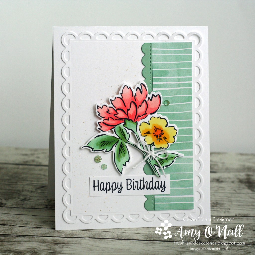 The flowers were colored with alcohol markers and cut out using the coordinating dies. I added a strip of coordinating dsp and cut a piece of Mint Macaron card stock using a scalloped die in the Hand-Penned bundle. Some fun little glittery gems were added as embellishments.