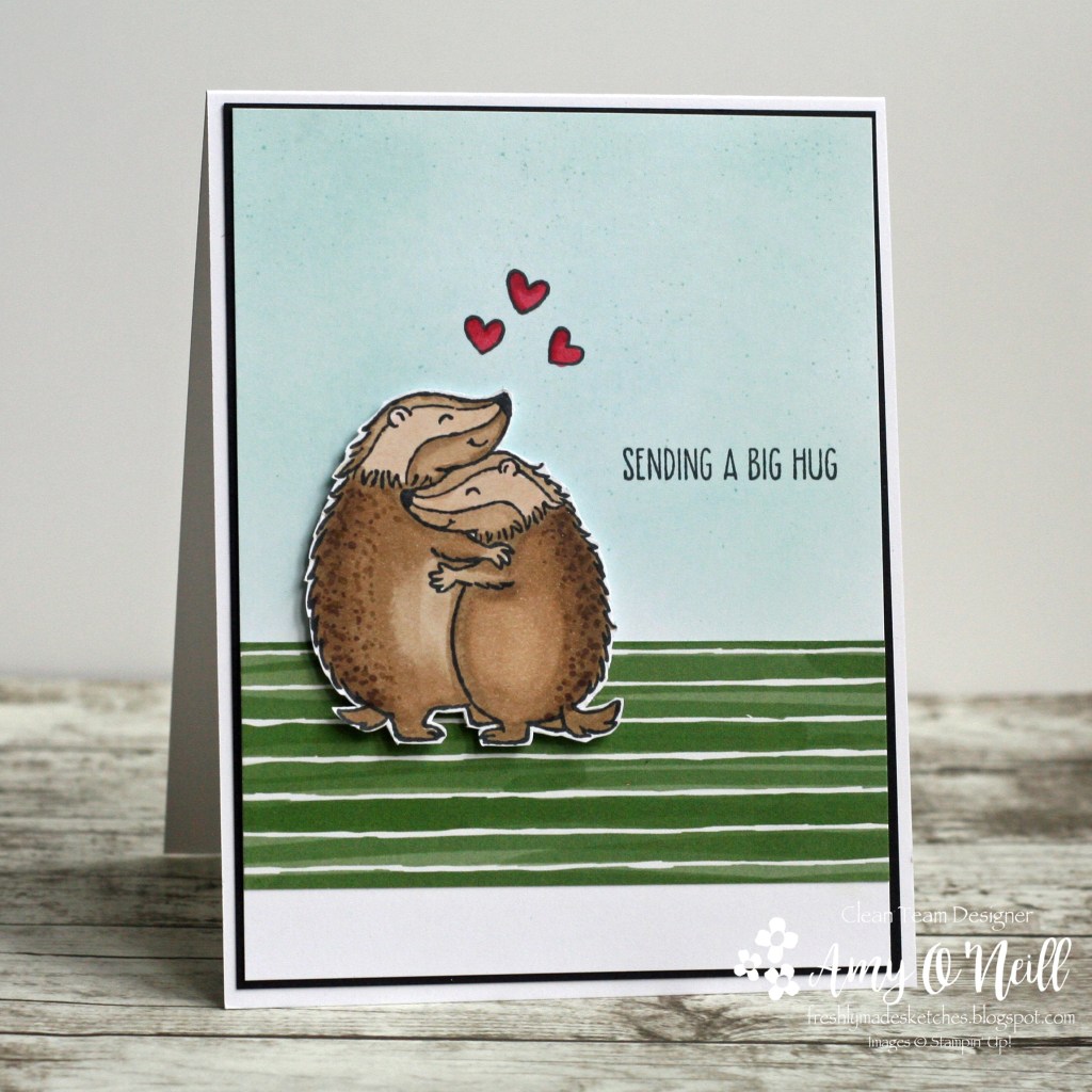 When I first saw the sketch, I immediately thought of Christmas trees. But when I examined my stamp shelf, I was surprised to find that I didn’t have a stamp set for this. What?!? I’ll have to fix that! But I did decide to use the Hearts & Hugs stamp set, and substitute these two cute little hedgehogs for the two isosceles triangles. I’m not really sure these critters are really hedgehogs, but that’s what I’m calling them.