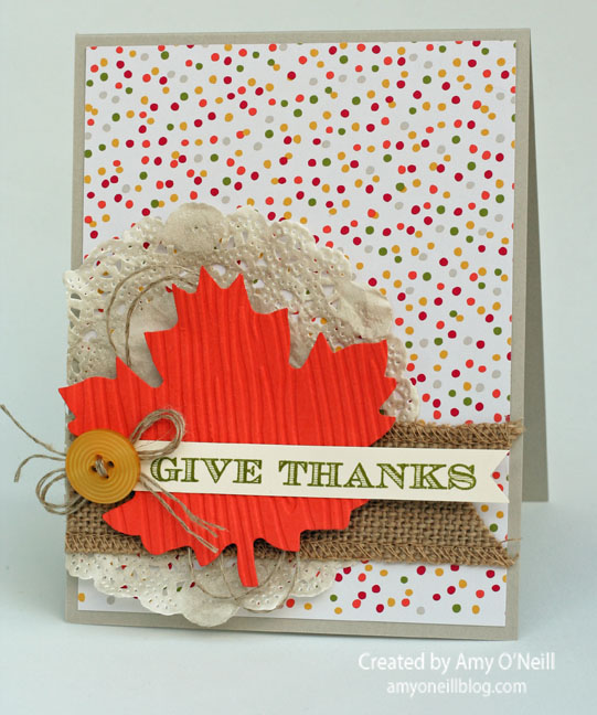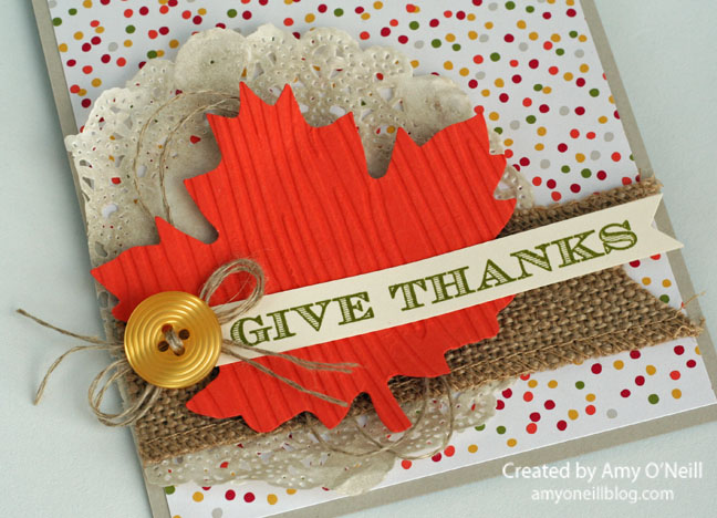 After adding the burlap ribbon, I added some loops of linen thread. I cut out a leaf with the Bigz Autumn Accents die using Tangerine Tango card stock, which I then ran through the Big Shot with the Woodgrain embossing folder.