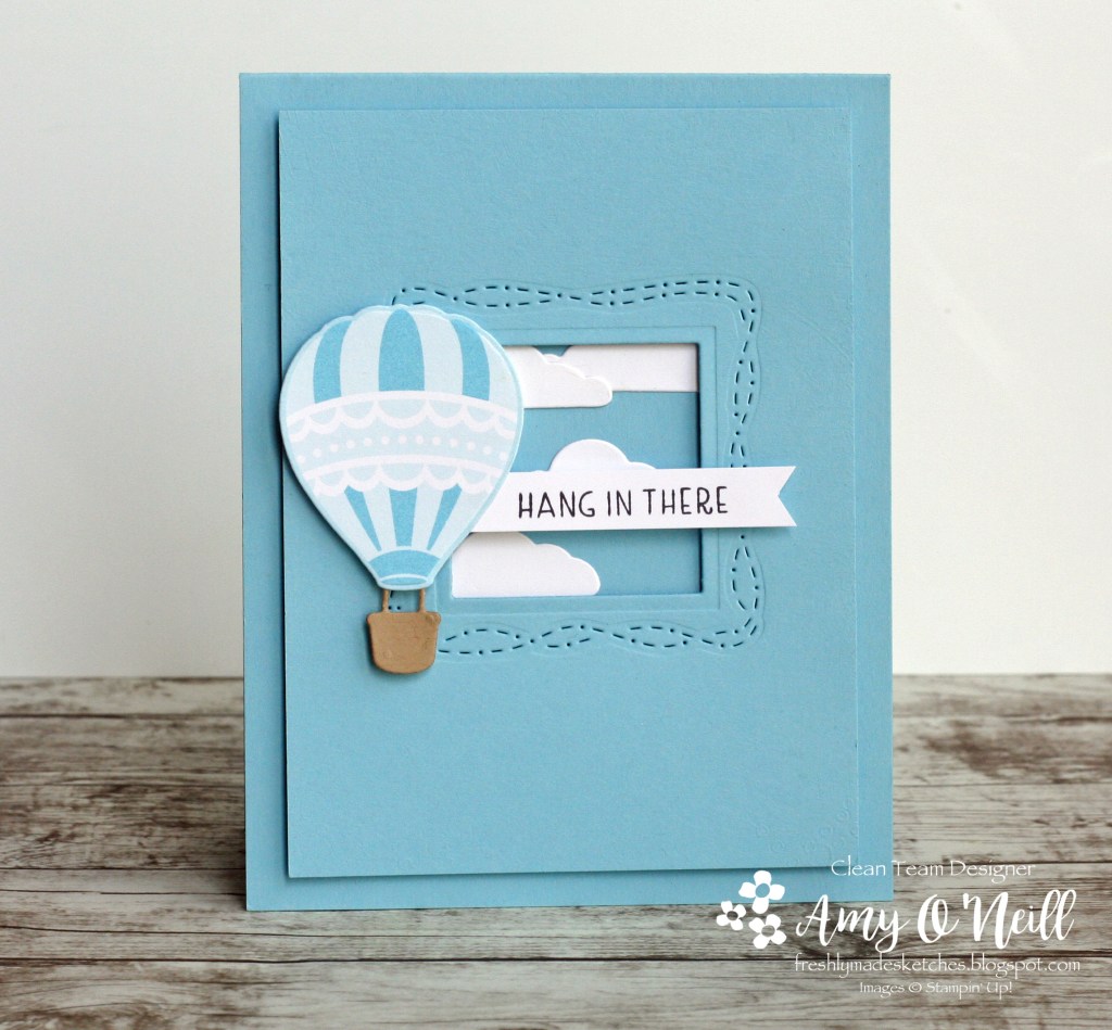 I thought that the square element in the sketch could be a window with clouds floating by in the background, so I cut out a square and then framed it using one of the Stitched with Whimsy Dies. I cut out the basket and clouds with the Hot Air Balloon dies and the balloon itself from a piece of the Lighter than Air dsp collection.