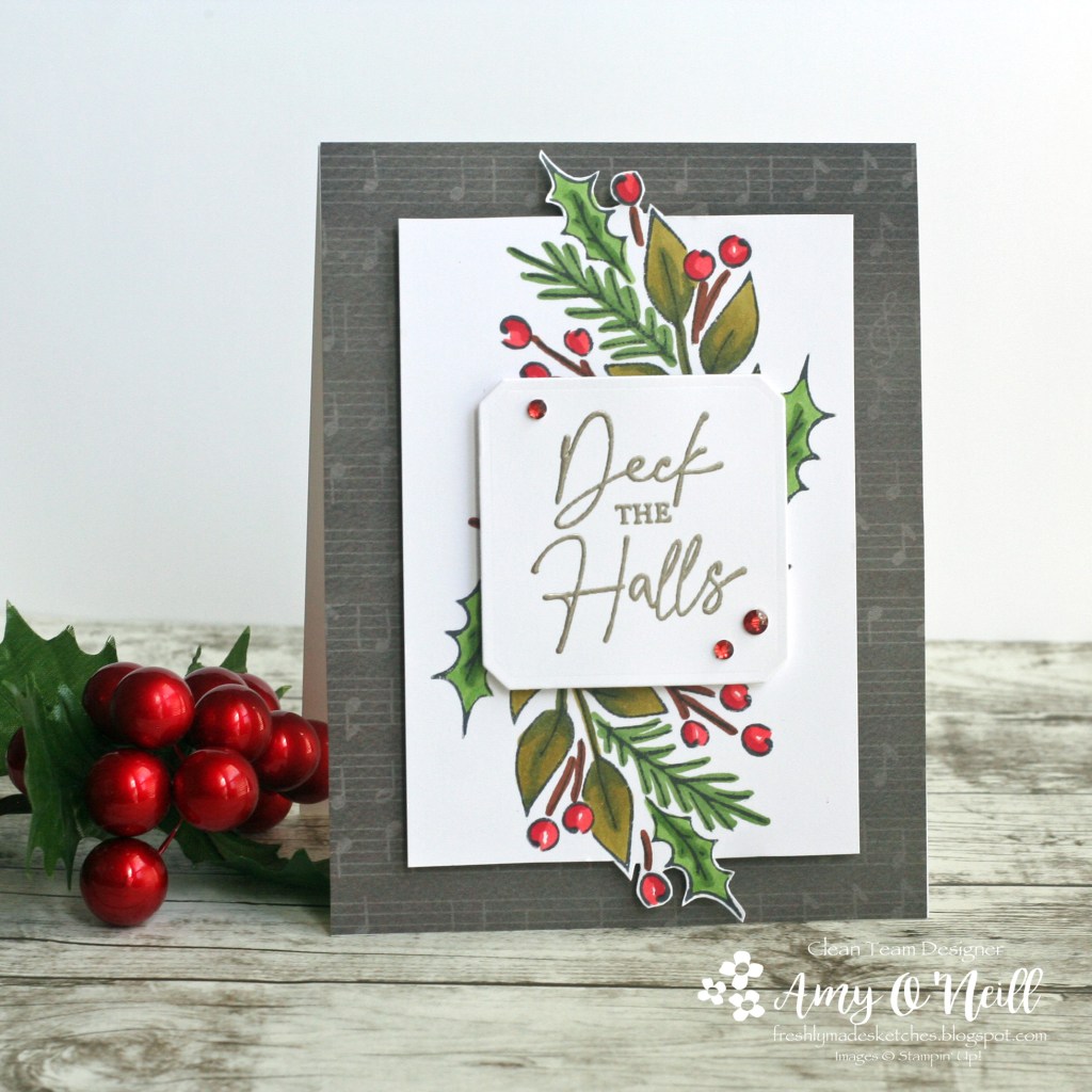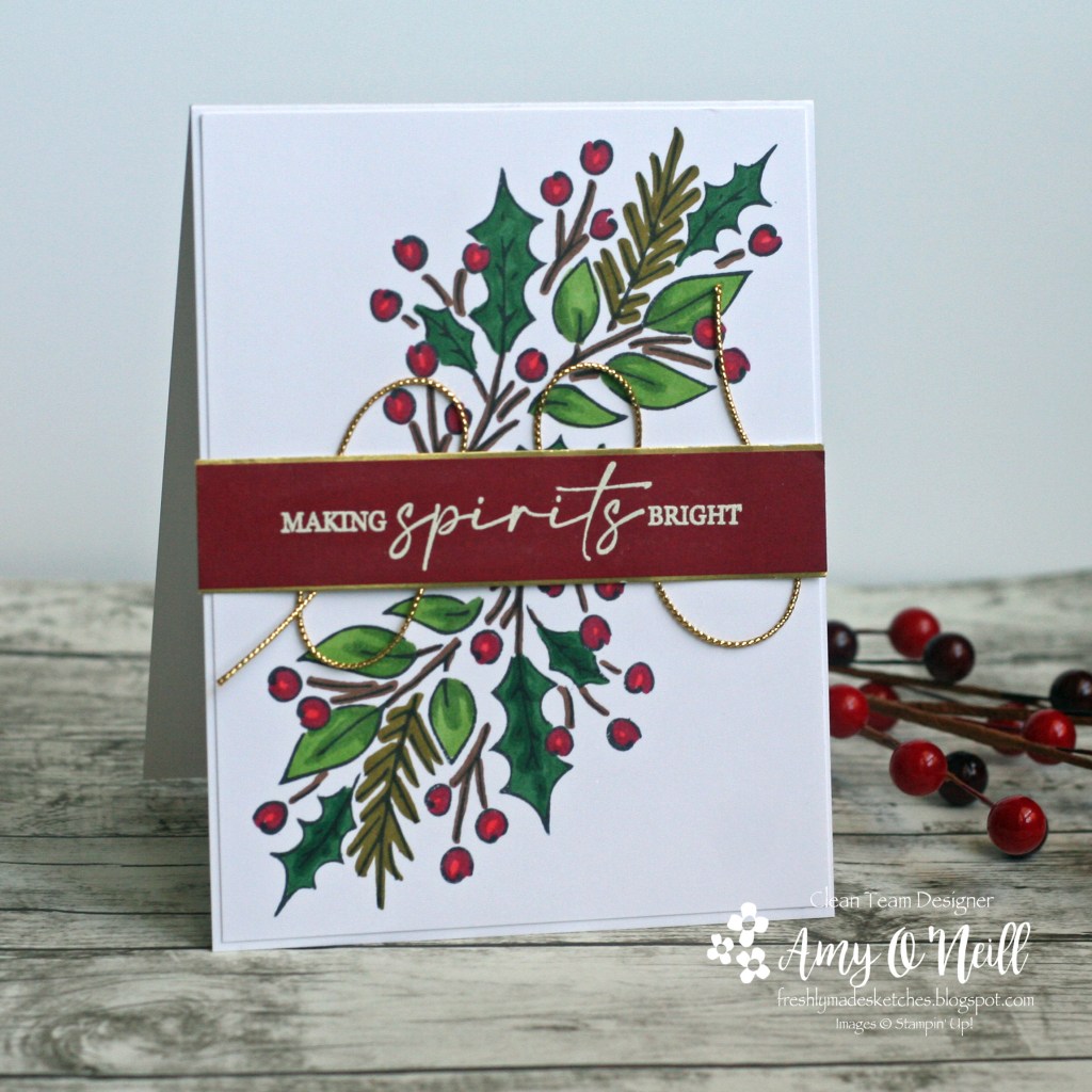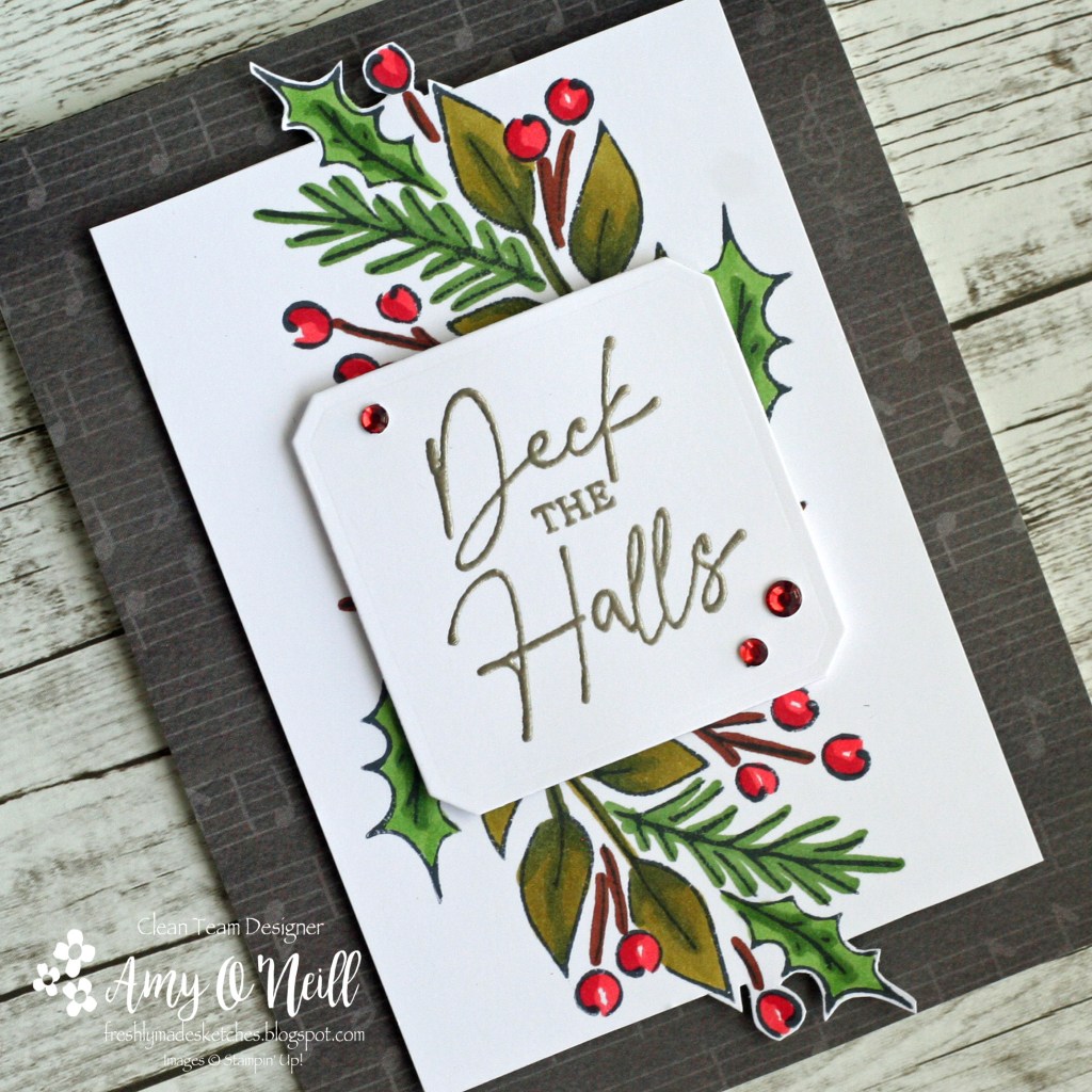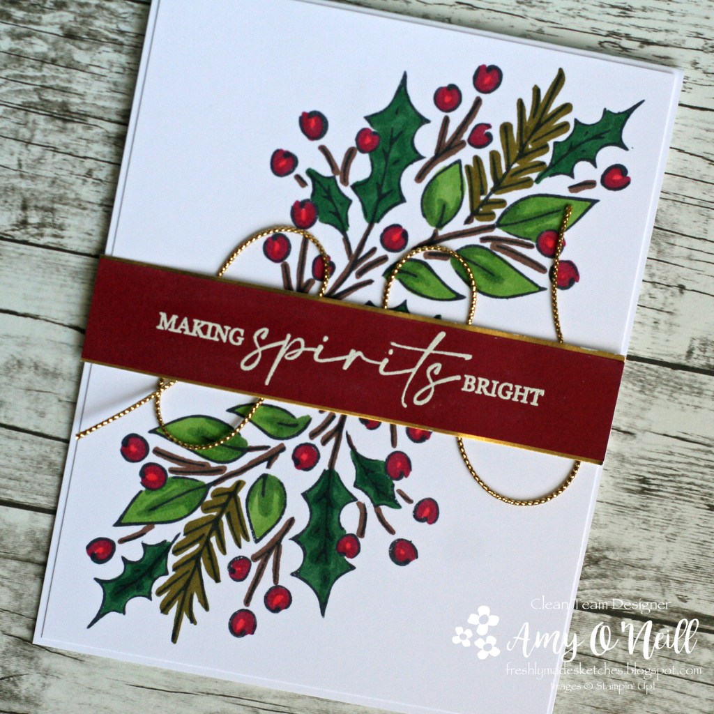 I used one of the greenery boughs from the Joy of Noel stamp set and stamped it twice – once on the top half of the card and again on the bottom half. I then colored it with my alcohol markers.