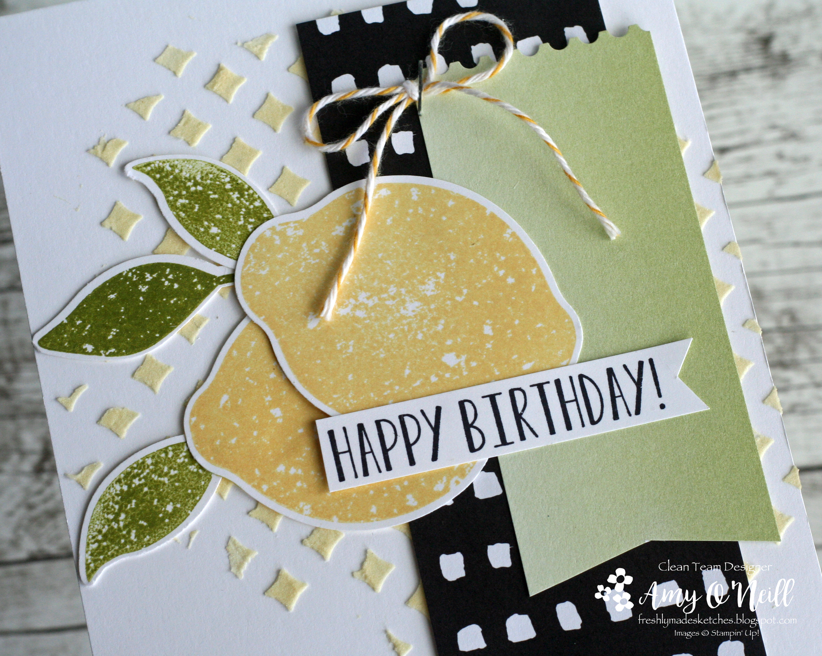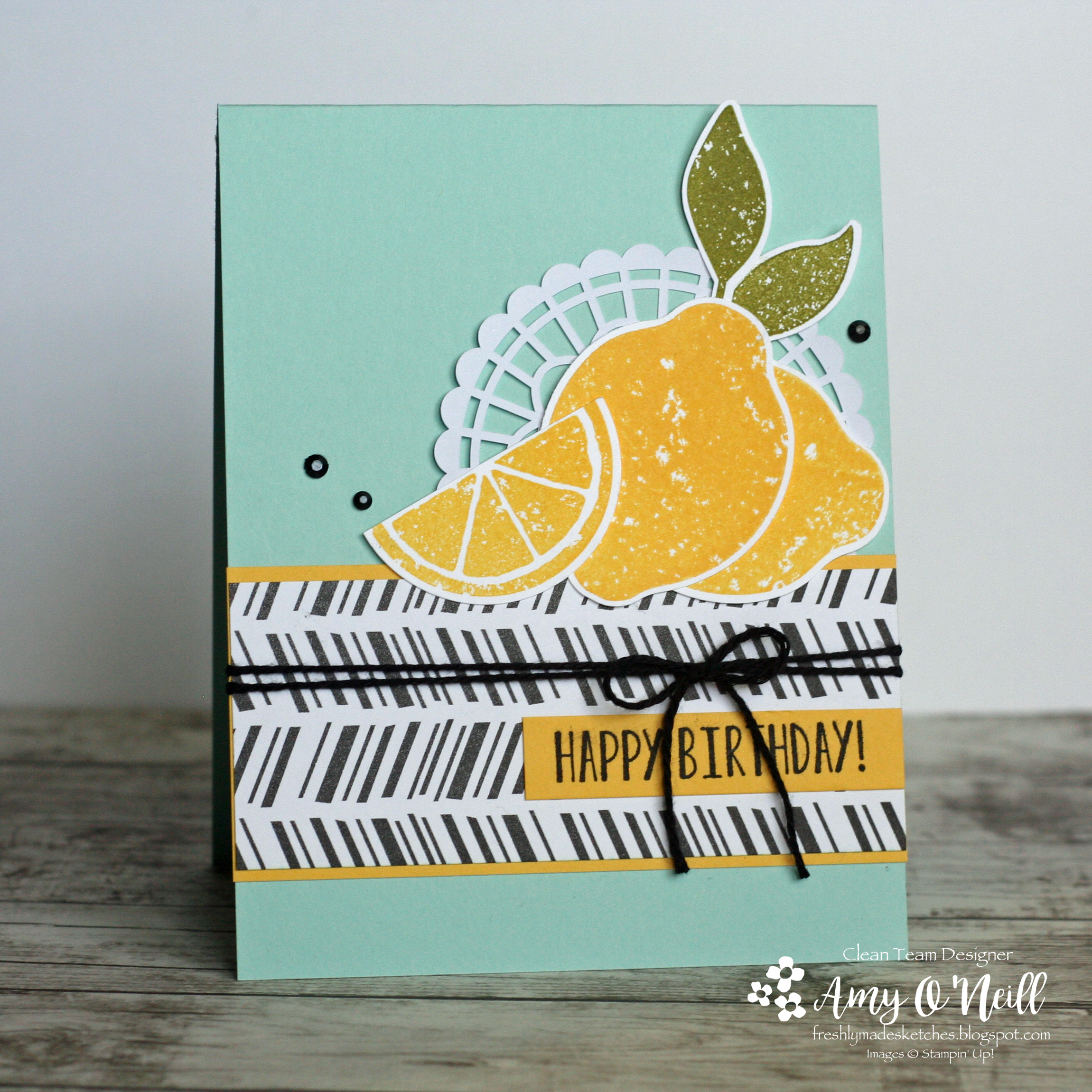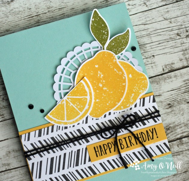I paired it with a piece of dsp from the Tropical Escape pack. A doily, black rhinestones, and some black twine were added as embellishments. I didn’t want to add much as I wanted the bold dsp and bright lemons to be the focal part of the card.