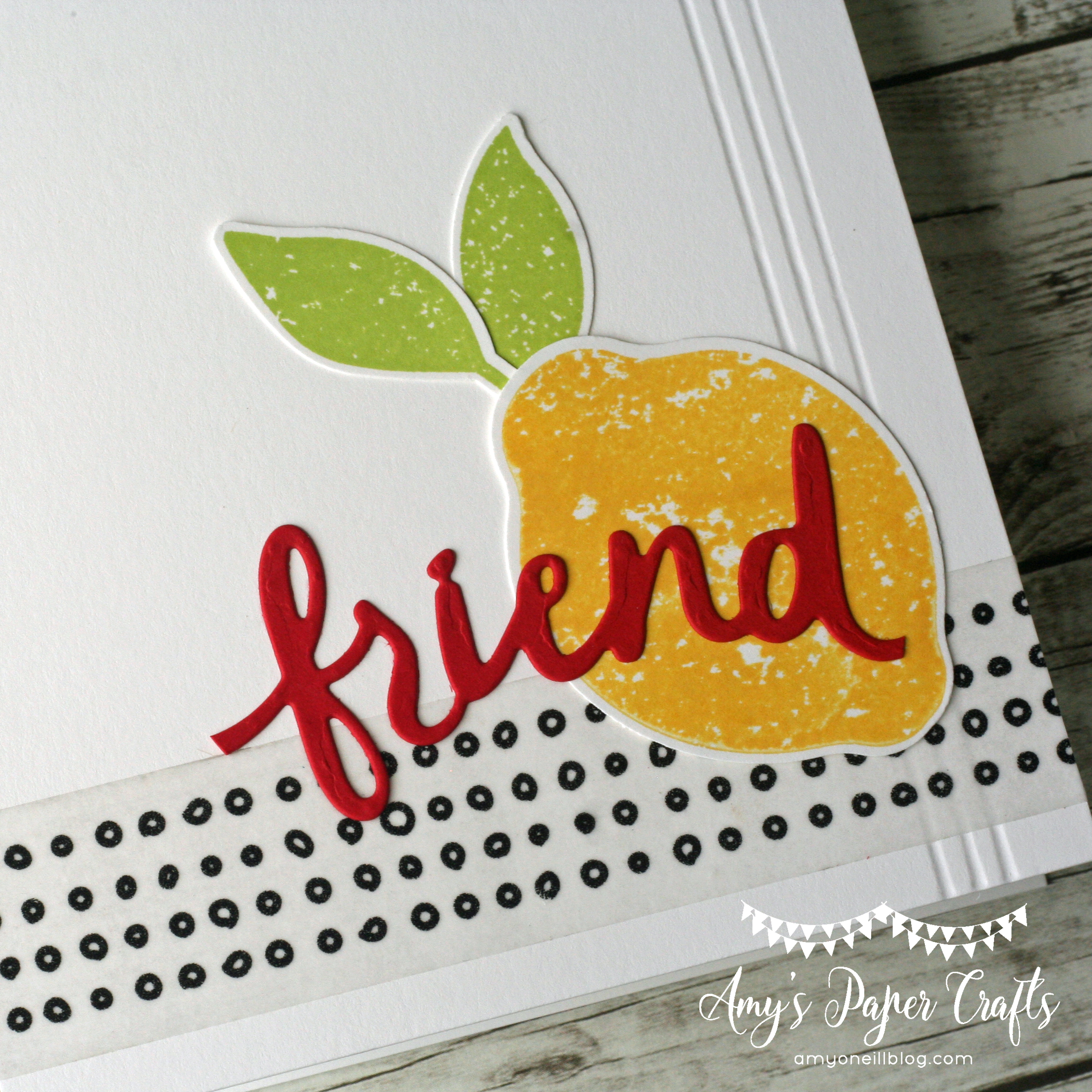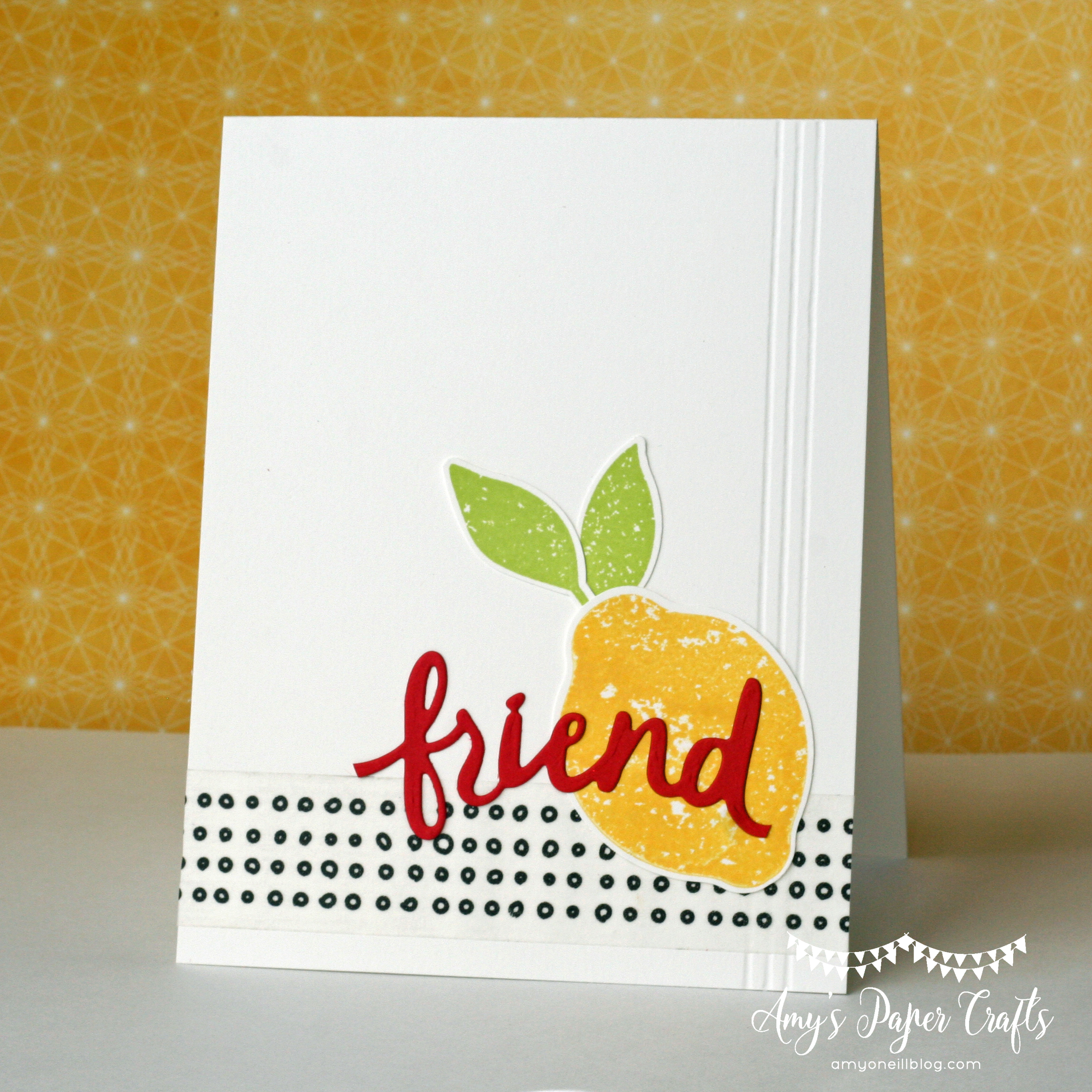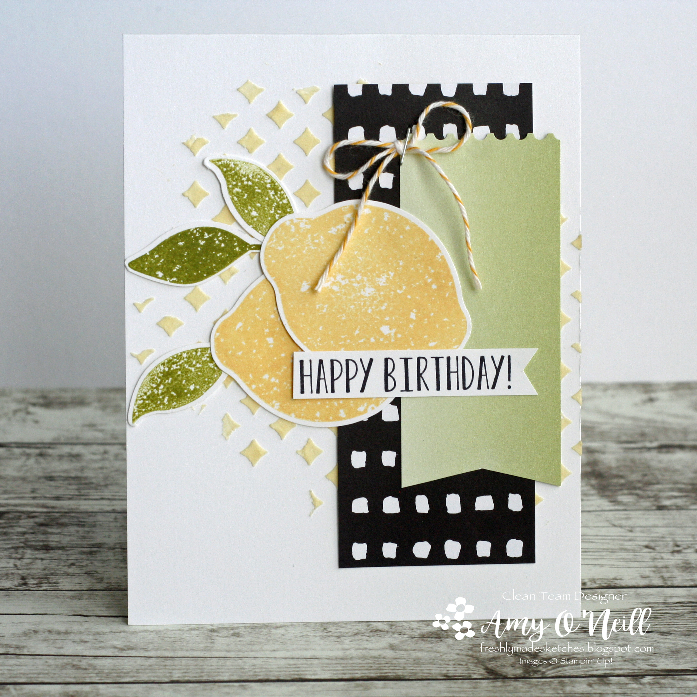 I paired it with a piece of dsp from the Tropical Escape pack. A doily, black rhinestones, and some black twine were added as embellishments. I didn’t want to add much as I wanted the bold dsp and bright lemons to be the focal part of the card.