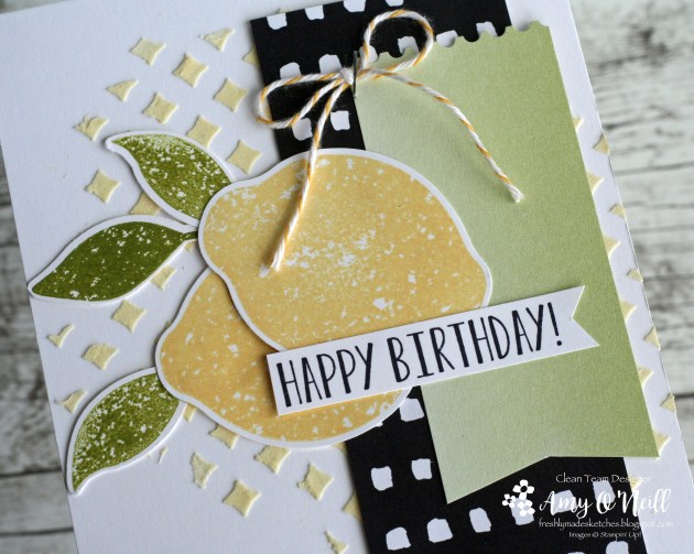 When searching for something to use for the circle shape in this sketch, I thought of several different new stamp sets that would work. But once it came to actually putting the card together, I just couldn’t get happy with anything. So I went back to my stamp shelf and pulled out a set that hasn’t seen ink in a while, Lemon Zest, and decided it was the one.
