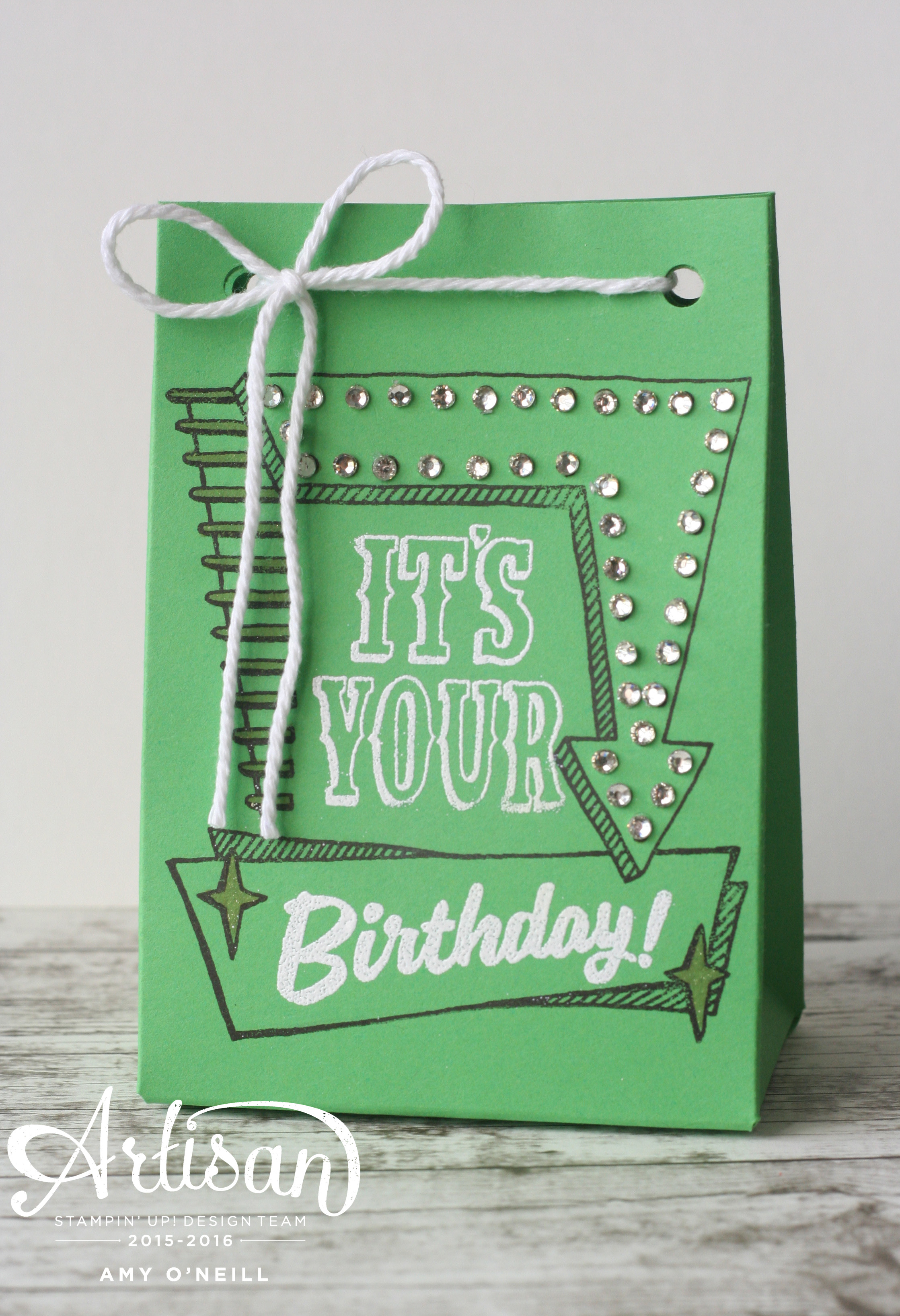 Cucumber Marquee BagI also made a little bag using the Gift Bag Punch Board.  I embossed the sentiments with white embossing powder and added gold Wink of Stella to the stars.  Little Rhinestone Basic Jewels were added to all of the lights on the arrow.